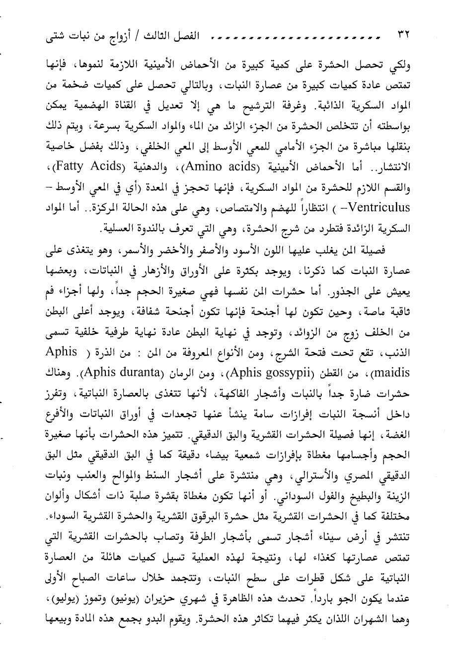 فصيلة المن يغلب عليها اللون الأسود والأصفر والأخضر والأسمر، وهو يتغذى على عصارة النبات كما ذكرنا، ويوجد بكثرة على الأوراق والأزهار في النباتات، وبعضها يعيش على الجذور. أما حشرات المن نفسها فهي صغيرة الحجم جدا، ولها أجزاء فم ثاقبة ماصة، وحين تكون لها أجنحة فإنها تكون أجنحة شفافة، ويوجد أعلى البطن من الخلف زوج من الزوائد، وتوجد في نهاية البطن عادة نهاية طرفية خلفية تسمى الذئب، تقع تحت فتحة الشرج، ومن الأنواع المعروفة من المن: من الذرة ( Aphis maidis)، من القطن ( aphis gossypii)، ومن الرمان ( Aphis duranta). وهناك حشرات ضارة جدا بالنبات وأشجار الفاكهة، لأنها تتغذى بالعصارة النباتية، وتفرز داخل أنسجة النبات إفرازات سامة ينشأ عنها تجعدات في أوراق النباتات والأفرع الغضة، إنها فصيلة الحشرات القشرية والبق الدقيقي. تتميز هذه الحشرات بأنها صغيرة الحجم وأجسامها مغطاة بإفرازات شمعية بيضاء دقيقة كما في البق الدقيقي مثل البق الدقيقي المصري والأسترالي، وهي منتشرة على أشجار السنط والموالح والعنب ونبات الزينة والبطيخ والفول السوداني. أو أنها تكون مغطاة بقشرة صلبة ذات أشكال وألوان مختلفة كما في الحشرات القشرية مثل حشرة البرقوق القشرية والحشرة القشرية السوداء.