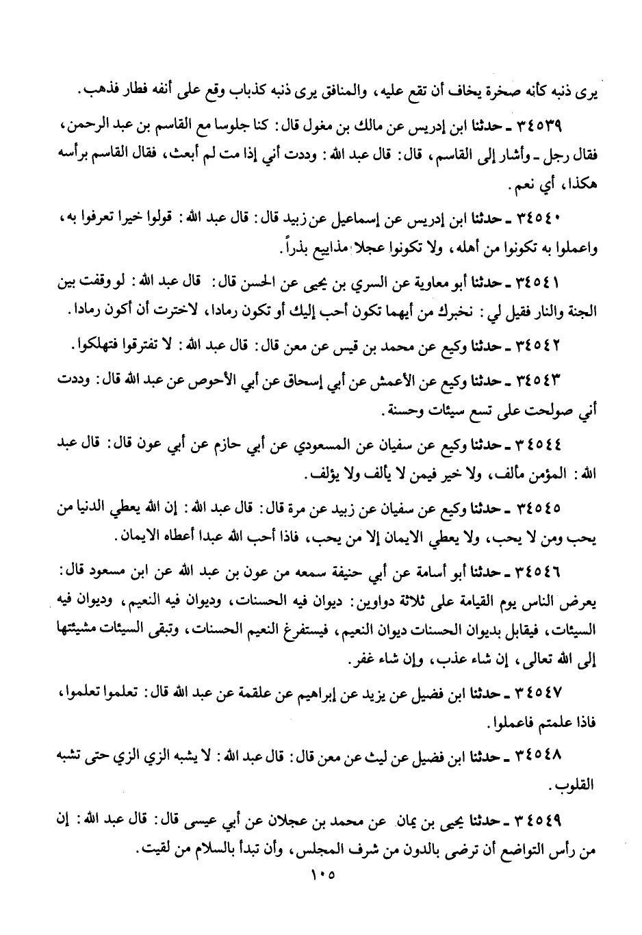 34543 - وَكِيعٌ، عَنْ، الْأَعْمَشِ، عَنْ، أَبِي إِسْحَاقَ، عَنْ، أَبِي الْأَحْوَصِ، عَنْ، عَبْدِ اللَّهِ، قَالَ: «§وَدِدْتُ أَنِّي صُولِحْتُ عَلَى تِسْعِ سَيِّئَاتٍ وَحَسَنَةٍ»