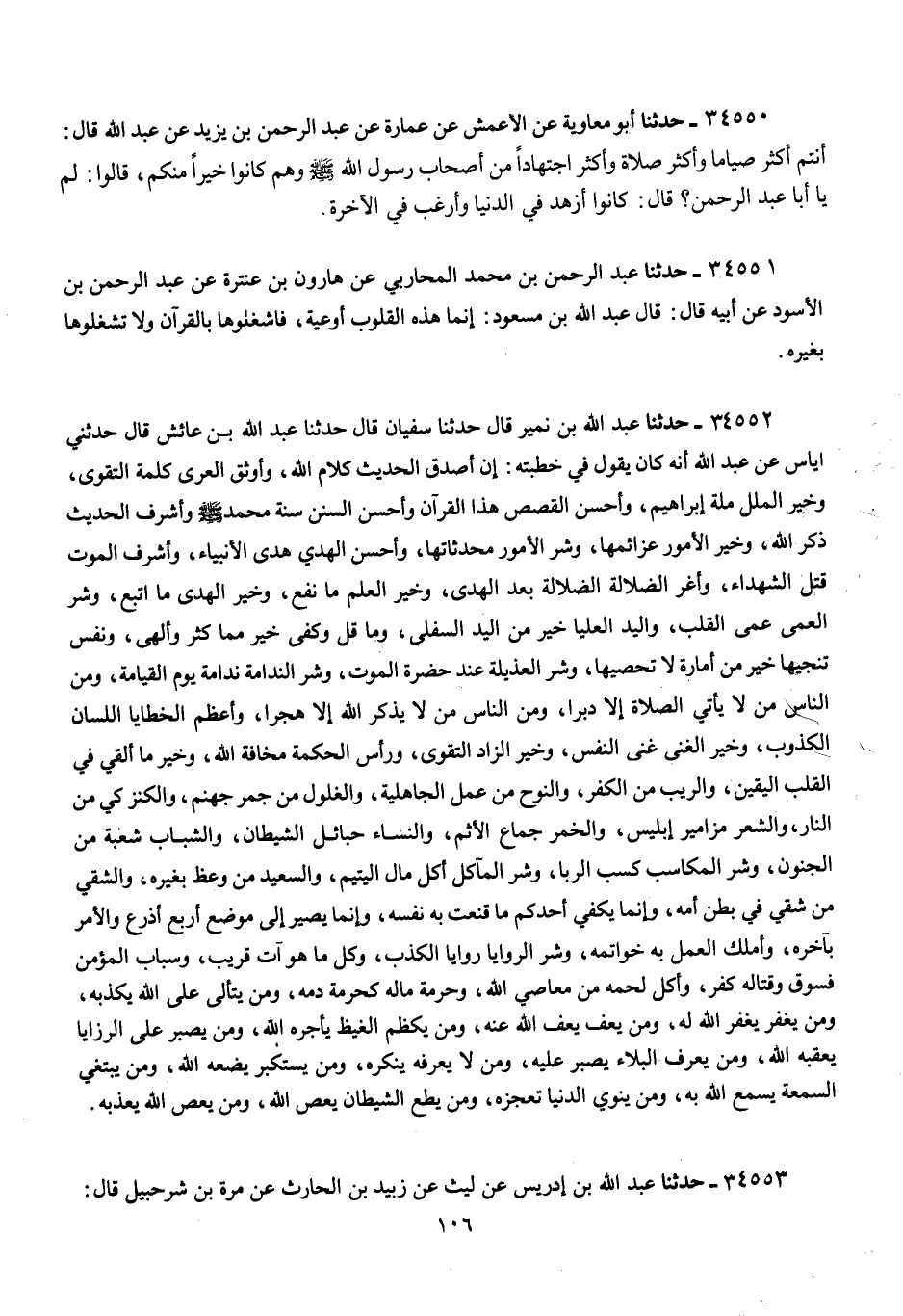 34552 - عَبْدُ اللَّهِ بْنُ نُمَيْرٍ، قَالَ: حَدَّثَنَا سُفْيَانُ، قَالَ حَدَّثَنَا عَبْدُ اللَّهِ بْنُ عَائِشٍ، قَالَ حَدَّثَنِي إِيَاسٌ، عَنْ عَبْدِ اللَّهِ، أَنَّهُ كَانَ يَقُولُ فِي خُطْبَتِهِ: §إِنَّ أَصْدَقَ الْحَدِيثِ كَلَامُ اللَّهِ , وَأَوْثَقَ الْعُرَى كَلِمَةُ التَّقْوَى , وَخَيْرَ الْمِلَلِ مِلَّةُ إِبْرَاهِيمَ , وَأَحْسَنَ الْقَصَصِ هَذَا الْقُرْآنُ , وَأَحْسَنَ السُّنَنِ سُنَّةُ مُحَمَّدٍ صَلَّى اللهُ عَلَيْهِ وَسَلَّمَ وَأَشْرَفَ الْحَدِيثِ ذِكْرُ اللَّهِ , وَخَيْرَ الْأُمُورِ عَزَائِمُهَا , وَشَرَّ الْأُمُورِ مُحْدَثَاتُهَا , وَأَحْسَنَ الْهَدْيِ هَدْيُ الْأَنْبِيَاءِ , وَأَشْرَفَ الْمَوْتِ قَتْلُ الشُّهَدَاءِ , وَأَغَرَّ الضَّلَالَةِ الضَّلَالَةُ بَعْدَ الْهُدَى , وَخَيْرَ الْعِلْمِ مَا نَفَعَ , وَخَيْرَ الْهُدَى مَا اتُّبِعَ , وَشَرَّ الْعَمَى عَمَى الْقَلْبِ , وَالْيَدَ الْعُلْيَا خَيْرٌ مِنَ الْيَدِ السُّفْلَى , وَمَا قَلَّ وَكَفَى خَيْرٌ مِمَّا كَثُرَ وَأَلْهَى , وَنَفْسٌ تُنْجِيهَا خَيْرٌ مِنْ أَمَارَةٍ لَا تُحْصِيهَا , وَشَرَّ الْعَذِيلَةِ عِنْدَ حَضْرَةِ الْمَوْتِ , وَشَرَّ النَّدَامَةِ نَدَامَةُ يَوْمِ الْقِيَامَةِ , وَمِنَ النَّاسِ مَنْ لَا يَأْتِي الصَّلَاةَ إِلَّا دُبُرًا , وَمِنَ النَّاسِ مَنْ لَا يَذْكُرُ اللَّهَ إِلَّا هَجْرًا , وَأَعْظَمَ الْخَطَايَا اللِّسَانُ الْكَذُوبُ , وَخَيْرَ الْغِنَى غِنَى النَّفْسِ , وَخَيْرَ الزَّادِ التَّقْوَى , وَرَأْسَ الْحِكْمَةِ مَخَافَةُ اللَّهِ , وَخَيْرَ مَا أُلْقِيَ فِي الْقَلْبِ الْيَقِينُ , وَالرَّيْبَ مِنَ الْكُفْرِ , وَالنَّوْحَ مِنْ عَمَلِ الْجَاهِلِيَّةِ , وَالْغُلُولَ مِنْ جَمْرِ جَهَنَّمَ , وَالْكَنْزَ كَيٌّ مِنَ النَّارِ , وَالشِّعْرَ مَزَامِيرُ إِبْلِيسَ , وَالْخَمْرَ جِمَاعُ الْإِثْمِ , وَالنِّسَاءَ حَبَائِلُ الشَّيْطَانِ , وَالشَّبَابَ شُعْبَةٌ مِنَ الْجُنُونِ , وَشَرَّ الْمَكَاسِبِ كَسْبُ الرِّبَا , وَشَرَّ الْمَآكِلِ أَكْلُ مَالِ الْيَتِيمِ , وَالسَّعِيدَ مَنْ وُعِظَ بِغَيْرِهِ , وَالشَّقِيَّ مِنْ شُقِيَ فِي بَطْنِ أُمِّهِ , وَإِنَّمَا يَكْفِي أَحَدُكُمْ مَا قَنَعَتْ بِهِ نَفْسُهُ , وَإِنَّمَا يَصِيرُ إِلَى مَوْضِعِ أَرْبَعِ أَذْرُعٍ وَالْأَمْرُ بِآخِرِهِ , وَأَمْلَكَ الْعَمَلِ بِهِ خَوَاتِمُهُ , وَشَرَّ الرِّوَايَا رِوَايَا الْكَذِبِ , وَكُلَّ مَا هُوَ آتٍ قَرِيبٌ , وَسِبَابَ الْمُؤْمِنِ فُسُوقٌ وَقِتَالَهُ كُفْرٌ , وَأَكْلَ لَحْمِهِ مِنْ مَعَاصِي اللَّهِ , وَحُرْمَةُ مَالِهِ كَحُرْمَةِ دَمِهِ , وَمَنْ يَتَأَلَّى عَلَى اللَّهِ يُكَذِّبْهُ , وَمَنْ يَغْفِرْ يَغْفِرِ اللَّهُ لَهُ , وَمَنْ يَعْفُ يَعْفُ اللَّهُ عَنْهُ , وَمَنْ يَكْظِمِ الْغَيْظَ يَأْجُرْهُ اللَّهُ , وَمَنْ يَصْبِرْ عَلَى الرَّزَايَا يُعْقِبْهُ اللَّهُ , وَمَنْ يَعْرِفُ الْبَلَاءَ يَصْبِرْ عَلَيْهِ , وَمَنْ لَا يَعْرِفْهُ يُنْكِرْهُ , وَمَنْ يَسْتَكْبِرْ يَضَعُهُ اللَّهُ , وَمَنْ يَبْتَغِ السُّمْعَةَ يُسَمِّعِ اللَّهُ بِهِ , وَمَنْ يَنْوِ الدُّنْيَا تُعْجِزْهُ , وَمَنْ يُطِعِ الشَّيْطَانَ يَعْصِ اللَّهَ , وَمَنْ يَعْصِ اللَّهَ يَعْذِبْهُ