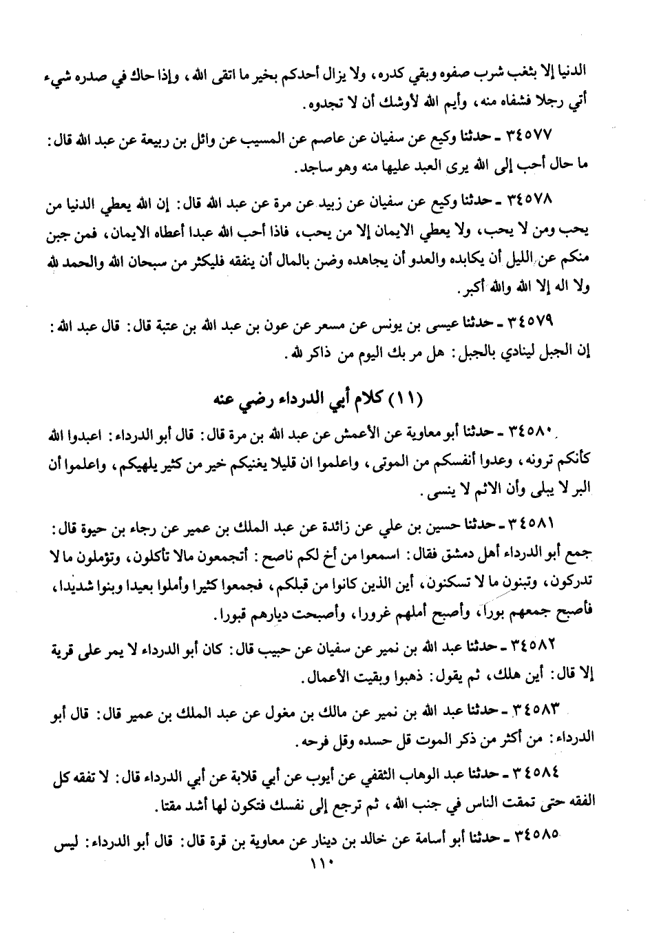 34580 - أَبُو مُعَاوِيَةَ، عَنِ الْأَعْمَشِ، عَنْ عَبْدِ اللَّهِ بْنِ مُرَّةَ، قَالَ: قَالَ أَبُو الدَّرْدَاءِ: «§اعْبُدُوا اللَّهَ كَأَنَّكُمْ تَرَوْنَهُ، وَعُدُّوا أَنْفُسَكُمْ مِنَ الْمَوْتَى، وَاعْلَمُوا أَنَّ قَلِيلًا يُغْنِيكُمْ خَيْرٌ مِنْ كَثِيرٍ يُلْهِيكُمْ، وَاعْلَمُوا أَنَّ الْبِرَّ لَا يَبْلَى، وَأَنَّ الْإِثْمَ لَا يُنْسَى»