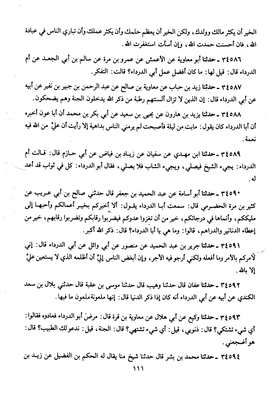 34587 - زَيْدُ بْنُ حُبَابٍ، عَنْ مُعَاوِيَةَ بْنِ صَالِحٍ، عَنْ عَبْدِ الرَّحْمَنِ بْنِ جُبَيْرِ بْنِ نُفَيْرٍ، عَنْ أَبِيهِ، عَنْ أَبِي الدَّرْدَاءِ، قَالَ: «إِنَّ §الَّذِينَ لَا تَزَالُ أَلْسِنَتُهُمْ رَطْبَةً مِنْ ذِكْرِ اللَّهِ يَدْخُلُونَ الْجَنَّةَ وَهُمْ يَضْحَكُونَ»