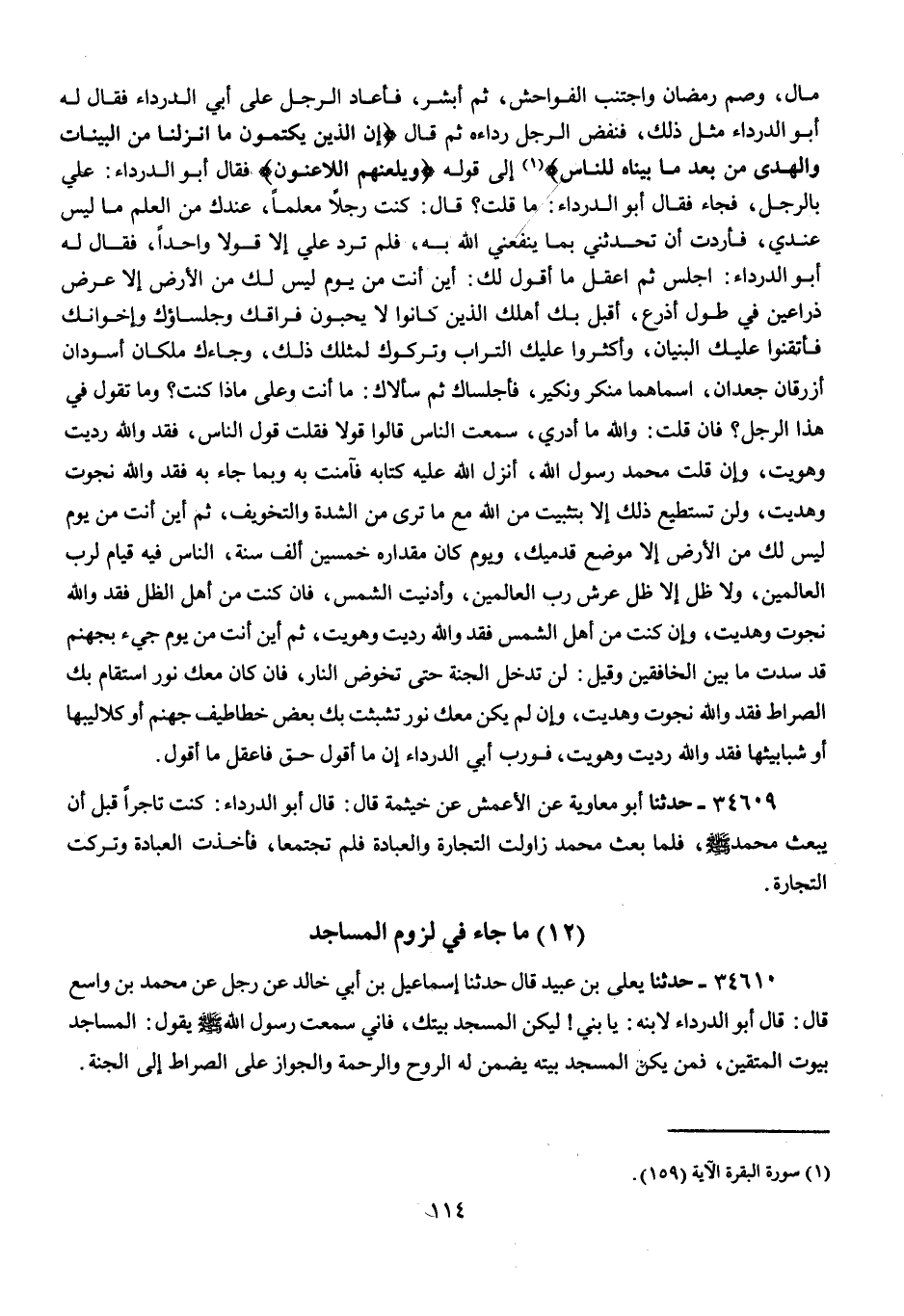 34610 - يَعْلَى بْنُ عُبَيْدٍ، قَالَ: حَدَّثَنَا إِسْمَاعِيلُ بْنُ أَبِي خَالِدٍ، عَنْ رَجُلٍ، عَنْ مُحَمَّدِ بْنِ وَاسِعٍ قَالَ: قَالَ أَبُو الدَّرْدَاءِ لِابْنِهِ: يَا بُنَيَّ، لِيَكُنِ الْمَسْجِدُ بَيْتَكَ، فَإِنِّي سَمِعْتُ رَسُولَ اللَّهِ صَلَّى اللهُ عَلَيْهِ وَسَلَّمَ، يَقُولُ: «§الْمَسَاجِدُ بُيُوتُ الْمُتَّقِينَ، فَمَنْ يَكُنِ الْمَسْجِدُ بَيْتَهُ يَضْمَنْ لَهُ الرُّوحَ وَالرَّحْمَةَ وَالْجَوَازَ عَلَى الصِّرَاطِ إِلَى الْجَنَّةِ»