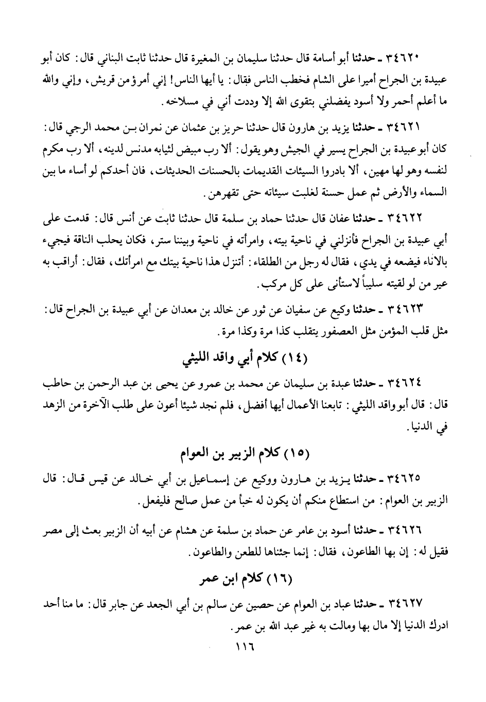 34624 - عَبْدَةُ بْنُ سُلَيْمَانَ، عَنْ مُحَمَّدِ بْنِ عَمْرٍو، عَنْ يَحْيَى بْنِ عَبْدِ الرَّحْمَنِ بْنِ حَاطِبٍ قَالَ: قَالَ أَبُو وَاقِدٍ اللَّيْثِيُّ: «§تَابَعْنَا الْأَعْمَالَ أَيُّهَا أَفْضَلُ، فَلَمْ نَجِدْ شَيْئًا أَعْوَنَ عَلَى طَلَبِ الْآخِرَةِ مِنَ الزُّهْدِ فِي الدُّنْيَا»