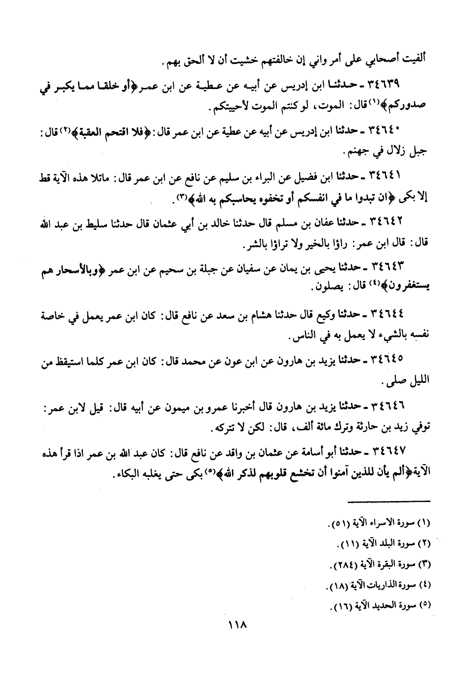 34647 - أَبُو أُسَامَةَ، عَنْ عُثْمَانَ بْنِ وَاقِدٍ، عَنْ نَافِعٍ، قَالَ: " كَانَ عَبْدُ اللَّهِ بْنُ عُمَرَ إِذَا قَرَأَ هَذِهِ الْآيَةَ {§أَلَمْ يَأْنِ لِلَّذِينَ آمَنُوا أَنْ تَخْشَعَ قُلُوبُهُمْ لِذِكْرِ اللَّهِ} [الحديد: 16] بَكَى حَتَّى يَغْلِبَهُ الْبُكَاءُ "