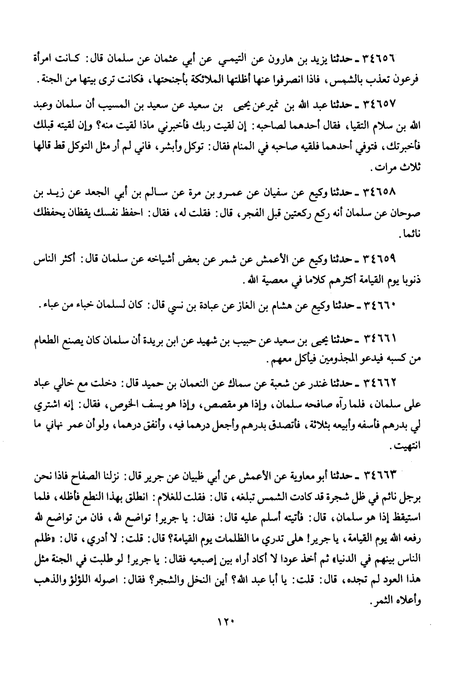 34663 - أَبُو مُعَاوِيَةَ، عَنِ الْأَعْمَشِ، عَنْ أَبِي ظَبْيَانَ، عَنْ جَرِيرٍ، قَالَ: نَزَلْنَا الصِّفَاحَ فَإِذَا نَحْنُ بِرَجُلٍ نَائِمٍ فِي ظِلِّ شَجَرَةٍ قَدْ كَادَتِ الشَّمْسُ تَبْلُغُهُ، قَالَ: فَقُلْتُ لِلْغُلَامِ: انْطَلِقْ بِهَذَا النِّطْعِ فَأَظِلَّهُ، فَلَمَّا اسْتَيْقَظَ إِذَا هُوَ سَلْمَانُ، قَالَ: فَأَتَيْتُهُ أُسَلِّمُ عَلَيْهِ، قَالَ: فَقَالَ: «يَا جَرِيرُ، §تَوَاضَعْ لِلَّهِ، فَإِنَّ مَنْ تَوَاضَعَ لِلَّهِ رَفَعَهُ اللَّهُ يَوْمَ الْقِيَامَةِ، يَا جَرِيرُ، هَلْ تَدْرِي مَا الظُّلُمَاتُ يَوْمَ الْقِيَامَةِ؟»، قَالَ: قُلْتُ: لَا أَدْرِي، قَالَ: «ظُلْمُ النَّاسِ بَيْنَهُمْ فِي الدُّنْيَا»، ثُمَّ أَخَذَ عُودًا لَا أَكَادُ أَرَاهُ بَيْنَ إِصْبَعَيْهِ فَقَالَ: «يَا جَرِيرُ، لَوْ طَلَبْتَ فِي الْجَنَّةِ مِثْلَ هَذَا الْعُودِ لَمْ تَجِدْهُ»، قَالَ: قُلْتُ: يَا أَبَا عَبْدِ اللَّهِ؟ أَيْنَ النَّخْلُ وَالشَّجَرُ؟ فَقَالَ: «أُصُولُهُ اللُّؤْلُؤُ وَالذَّهَبُ وَأَعْلَاهُ الثَّمَرُ»