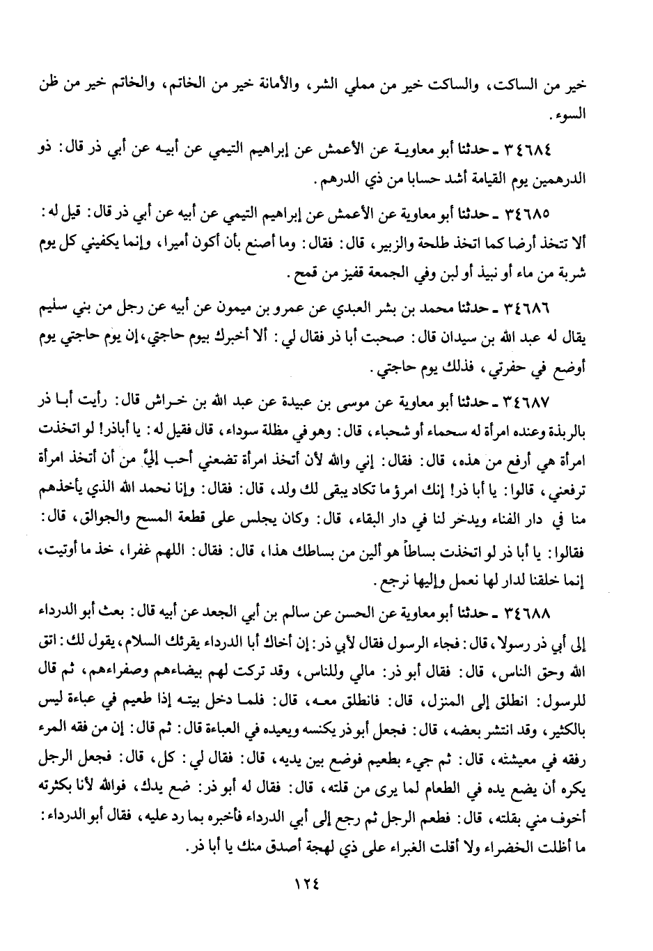 34688 - أَبُو مُعَاوِيَةَ، عَنِ الْحَسَنِ، عَنْ سَالِمِ بْنِ أَبِي الْجَعْدِ، عَنْ أَبِيهِ قَالَ: بَعَثَ أَبُو الدَّرْدَاءِ إِلَى أَبِي ذَرٍّ رَسُولًا، قَالَ: فَجَاءَ الرَّسُولُ فَقَالَ لِأَبِي ذَرٍّ: إِنَّ أَخَاكَ أَبَا الدَّرْدَاءِ يُقْرِئُكَ السَّلَامَ، يَقُولُ لَكَ: اتَّقِ اللَّهَ وَحَقَّ النَّاسِ، قَالَ: فَقَالَ أَبُو ذَرٍّ: «§مَالِي وَلِلنَّاسِ، وَقَدْ تَرَكْتُ لَهُمْ بَيْضَاءَهُمْ وَصَفْرَاءَهُمْ»، ثُمَّ قَالَ لِلرَّسُولِ: «انْطَلِقْ إِلَى الْمَنْزِلِ»، قَالَ: فَانْطَلَقَ مَعَهُ، قَالَ: " فَلَمَّا دَخَلَ بَيْتَهُ إِذَا طُعَيْمٌ فِي عَبَاءَةٍ لَيْسَ بِالْكَثِيرِ، وَقَدِ انْتَشَرَ بَعْضُهُ، قَالَ: فَجَعَلَ أَبُو ذَرٍّ يَكْنِسُهُ وَيُعِيدُهُ فِي الْعَبَاءَةِ، قَالَ: ثُمَّ قَالَ: «إِنَّ مِنْ فِقْهِ الْمَرْءِ رِفْقَهُ فِي مَعِيشَتِهِ»، قَالَ: ثُمَّ جِيءَ بِطُعَيْمٍ فَوُضِعَ بَيْنَ يَدَيْهِ، قَالَ: فَقَالَ لِي: «كُلْ»، قَالَ: فَجَعَلَ الرَّجُلُ يَكْرَهُ أَنْ يَضَعَ يَدَهُ فِي الطَّعَامِ لِمَا يَرَى مِنْ قِلَّتِهِ، قَالَ: فَقَالَ لَهُ أَبُو ذَرٍّ: «ضَعْ يَدَكَ، فَوَاللَّهِ لَأَنَا بِكَثْرَتِهِ أَخْوَفُ مِنِّي بِقِلَّتِهِ»، قَالَ: فَطَعِمَ الرَّجُلُ ثُمَّ رَجَعَ إِلَى أَبِي الدَّرْدَاءِ فَأَخْبَرَهُ بِمَا رَدَّ عَلَيْهِ، فَقَالَ أَبُو الدَّرْدَاءِ: مَا أَظَلَّتِ الْخَضْرَاءُ، وَلَا أَقَلَّتْ الْغَبْرَاءُ عَلَى ذِي لَهْجَةٍ أَصْدَقَ مِنْكَ يَا أَبَا ذَرٍّ