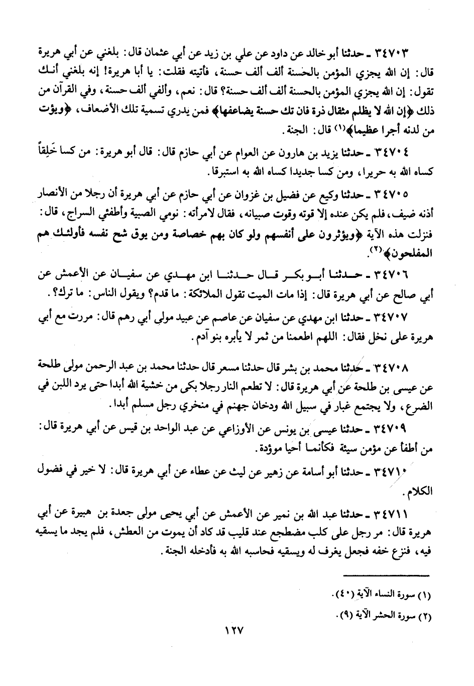34703 - أَبُو خَالِدٍ، عَنْ دَاوُدَ، عَنْ عَلِيِّ بْنِ زَيْدٍ، عَنْ أَبِي عُثْمَانَ، قَالَ: بَلَغَنِي، عَنْ أَبِي هُرَيْرَةَ، قَالَ: «إِنَّ §اللَّهَ يُجْزِي الْمُؤْمِنَ بِالْحَسَنَةِ أَلْفَ أَلْفِ حَسَنَةٍ»، فَأَتَيْتُهُ فَقُلْتُ: يَا أَبَا هُرَيْرَةَ، إِنَّهُ بَلَغَنِي أَنَّكَ تَقُولُ: إِنَّ اللَّهَ يَجْزِي الْمُؤْمِنَ بِالْحَسَنَةِ أَلْفَ أَلْفِ حَسَنَةٍ؟ قَالَ: " نَعَمْ، وَأَلْفَيْ أَلْفِ حَسَنَةٍ، وَفِي الْقُرْآنِ مِنْ ذَلِكَ {إِنَّ اللَّهَ لَا يَظْلِمُ مِثْقَالَ ذَرَّةٍ وَإِنْ تَكُ حَسَنَةً يُضَاعِفْهَا} [النساء: 40]، فَمَنْ يَدْرِي تَسْمِيَةَ تِلْكَ الْأَضْعَافِ، {وَيُؤْتِ مِنْ لَدُنْهُ أَجْرًا عَظِيمًا} [النساء: 40] "، قَالَ: الْجَنَّةُ