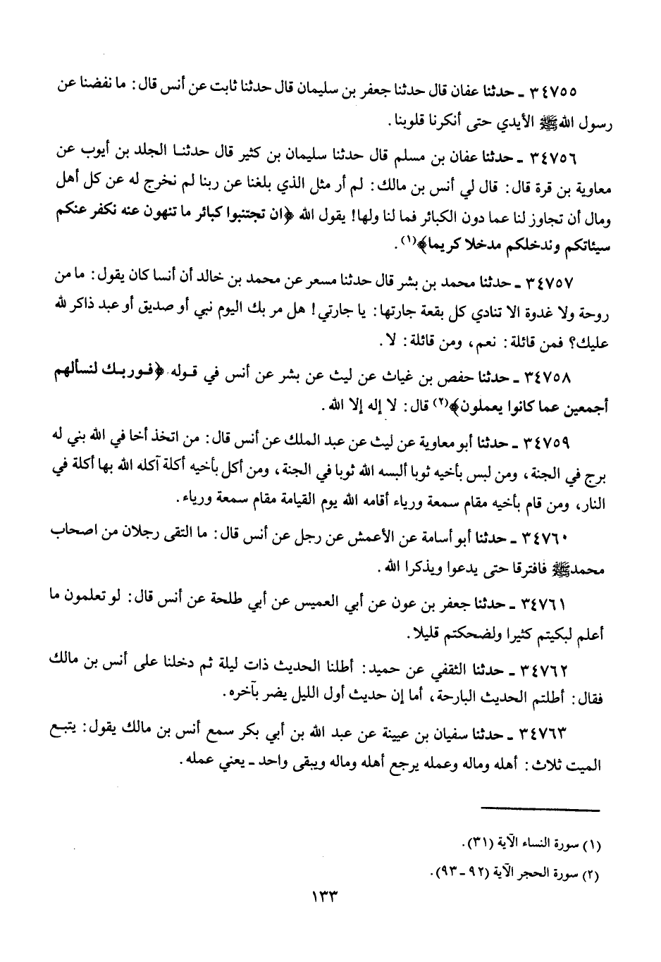 34756 - عَفَّانَ بْنُ مُسْلِمٍ، قَالَ: حَدَّثَنَا سُلَيْمَانُ بْنُ كَثِيرٍ، قَالَ: حَدَّثَنَا الْجَلْدُ بْنُ أَيُّوبَ، عَنْ مُعَاوِيَةَ بْنِ قُرَّةَ، قَالَ: قَالَ لِي أَنَسُ بْنُ مَالِكٍ: " §لَمْ أَرَ مِثْلَ الَّذِي بَلَغَنَا عَنْ رَبِّنَا لَمْ نَخْرُجْ لَهُ عَنْ كُلِّ أَهْلٍ وَمَالٍ أَنْ تَجَاوَزَ لَنَا عَمَّا دُونَ الْكَبَائِرِ فَمَا لَنَا وَلَهَا يَقُولُ اللَّهُ: {إِنْ تَجْتَنِبُوا كَبَائِرَ مَا تُنْهَوْنَ عَنْهُ نُكَفِّرْ عَنْكُمْ سَيِّئَاتِكُمْ وَنُدْخِلْكُمْ مُدْخَلًا كَرِيمًا} [النساء: 31] "