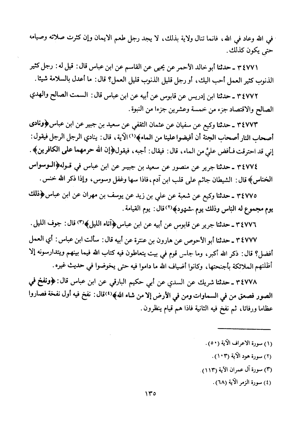 34773 - وَكِيعٌ، عَنْ سُفْيَانَ، عَنْ عُثْمَانَ الثَّقَفِيِّ، عَنْ سَعِيدِ بْنِ جُبَيْرٍ، عَنِ ابْنِ عَبَّاسٍ: {§وَنَادَى أَصْحَابُ النَّارِ أَصْحَابَ الْجَنَّةِ أَنْ أَفِيضُوا عَلَيْنَا مِنَ الْمَاءِ} [الأعراف: 50] الْآيَةُ، قَالَ: " يُنَادِي الرَّجُلُ الرَّجُلَ فَيَقُولُ: إِنِّي قَدِ احْتَرَقْتُ فَأَفِضْ عَلَيَّ مِنَ الْمَاءِ "، قَالَ: " فَيُقَالُ: أَجِبْهُ، فَيَقُولُ: {إِنَّ اللَّهَ حَرَّمَهُمَا عَلَى الْكَافِرِينَ} [الأعراف: 50] "