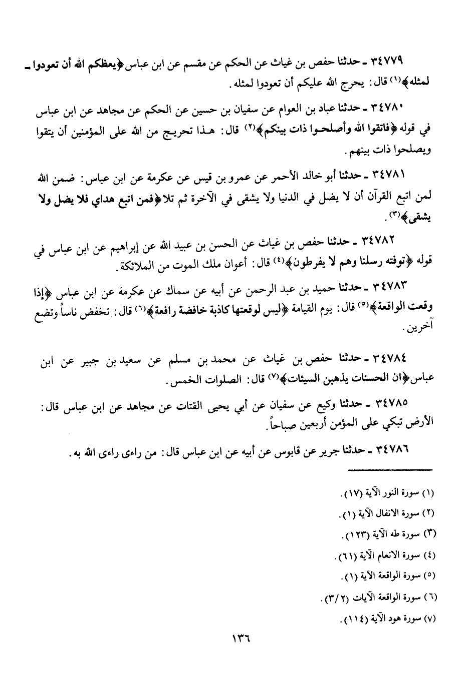 34784 - حَفْصُ بْنُ غِيَاثٍ، عَنْ مُحَمَّدِ بْنِ مُسْلِمٍ، عَنْ سَعِيدِ بْنِ جُبَيْرٍ، عَنِ ابْنِ عَبَّاسٍ: " {§إِنَّ الْحَسَنَاتِ يُذْهِبْنَ السَّيِّئَاتِ} [هود: 114] "، قَالَ: «الصَّلَوَاتُ الْخَمْسُ»