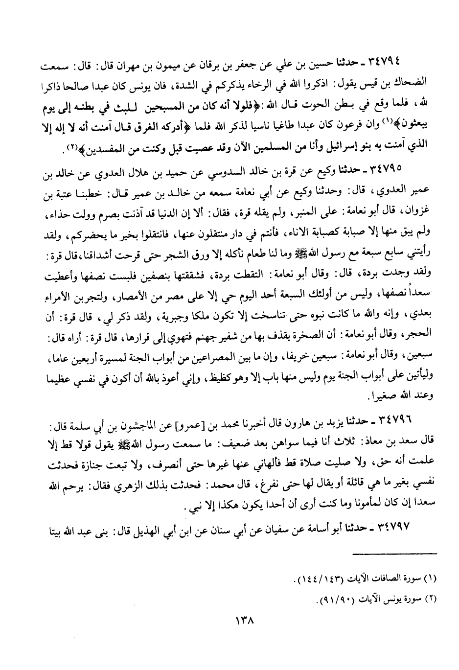 34795 - وَكِيعٌ، عَنْ قُرَّةَ بْنِ خَالِدٍ السَّدُوسِيِّ، عَنْ حُمَيْدِ بْنِ هِلَالٍ الْعَدَوِيِّ، عَنْ خَالِدِ بْنِ عُمَيْرٍ الْعَدَوِيِّ قَالَ: وَحَدَّثَنَا وَكِيعٌ، عَنْ أَبِي نَعَامَةَ، سَمِعَهُ مِنْ خَالِدِ بْنِ عُمَيْرٍ قَالَ: خَطَبَنَا عُتْبَةُ بْنُ غَزْوَانَ ـ قَالَ أَبُو نَعَامَةَ: عَلَى الْمِنْبَرِ، وَلَمْ يَقُلْهُ قُرَّةُ ـ فَقَالَ: «أَلَا إِنَّ §الدُّنْيَا قَدْ آذَنَتْ بِصَرْمٍ وَوَلَّتْ حَذَّاءَ، وَلَمْ يَبْقَ مِنْهَا إِلَّا صُبَابَةٌ كَصُبَابَةِ الْإِنَاءِ، فَأَنْتُمْ فِي دَارٍ مُنْتَقِلُونَ عَنْهَا، فَانْتَقِلُوا بِخَيْرِ مَا يَحْضُرُكُمْ، وَلَقَدْ رَأَيْتنِي سَابِعَ سَبْعَةٍ مَعَ رَسُولِ اللَّهِ صَلَّى اللهُ عَلَيْهِ وَسَلَّمَ وَمَا لَنَا طَعَامٌ نَأْكُلُهُ إِلَّا وَرَقُ الشَّجَرِ حَتَّى قَرِحَتْ أَشْدَاقُنَا»، قَالَ قُرَّةُ: «وَلَقَدْ وَجَدْتُ بُرْدَةً»، قَالَ: وَقَالَ أَبُو نَعَامَةَ: «الْتَقَطْتُ بُرْدَةً، فَشَقَقْتُهَا بِنِصْفَيْنِ فَلَبِسْتُ نِصْفَهَا وَأَعْطَيْتُ سَعْدًا نِصْفَهَا، وَلَيْسَ مِنْ أُولَئِكَ السَّبْعَةِ أَحَدٌ الْيَوْمَ حَيٌّ إِلَّا عَلَى مِصْرٍ مِنَ الْأَمْصَارِ، وَلَتُجَرِّبُنَّ الْأُمَرَاءَ بَعْدِي، وَإِنَّهُ وَاللَّهِ مَا كَانَتْ نُبُوَّةٌ حَتَّى تَنَاسَخَتْ إِلَّا تَكُونُ مُلْكًا وَجَبْرِيَّةً، وَلَقَدْ ذَكَرَ لِي»، قَالَ قُرَّةُ: «إِنَّ الْحَجَرَ»، وَقَالَ أَبُو نَعَامَةَ: «إِنَّ الصَّخْرَةَ يُقْذَفُ بِهَا مِنْ شَفِيرِ جَهَنَّمَ فَتَهْوِي إِلَى قَرَارِهَا»، قَالَ قُرَّةُ: أَرَاهُ قَالَ: «سَبْعِينَ»، وَقَالَ أَبُو نَعَامَةَ: «سَبْعِينَ خَرِيفًا، وَإِنَّ مَا بَيْنَ الْمِصْرَاعَيْنِ مِنْ أَبْوَابِ الْجَنَّةِ لِمَسِيرَةِ أَرْبَعِينَ عَامًا، وَلَيَأْتِيَنَّ عَلَى أَبْوَابِ الْجَنَّةِ يَوْمٌ وَلَيْسَ مِنْهَا بَابٌ إِلَّا وَهُوَ كَظِيظٌ، وَإِنِّي أَعُوذُ بِاللَّهِ أَنْ أَكُونَ فِي نَفْسِي عَظِيمًا وَعِنْدَ اللَّهِ صَغِيرًا»