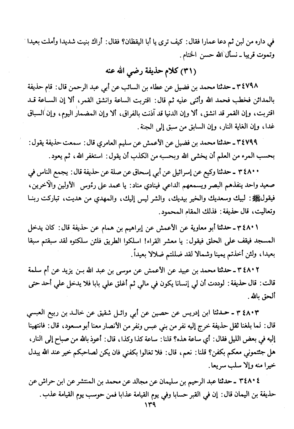 34798 - مُحَمَّدُ بْنُ فُضَيْلٍ، عَنْ عَطَاءِ بْنِ السَّائِبِ، عَنْ أَبِي عَبْدِ الرَّحْمَنِ، قَالَ: قَامَ حُذَيْفَةُ بِالْمَدَائِنِ فَخَطَبَ فَحَمِدَ اللَّهَ وَأَثْنَى عَلَيْهِ، ثُمَّ قَالَ: {اقْتَرَبَتِ السَّاعَةُ وَانْشَقَّ الْقَمَرُ} [القمر: 1]: «§أَلَا إِنَّ السَّاعَةَ قَدِ اقْتَرَبَتْ، وَإِنَّ الْقَمَرَ قَدِ انْشَقَّ، أَلَا وَإِنَّ الدُّنْيَا قَدْ أَذِنَتْ بِالْفِرَاقِ، أَلَّا وَإِنَّ الْمِضْمَارَ الْيَوْمُ، وَإِنَّ السِّبَاقَ غَدًا، وَإِنَّ الْغَايَةَ النَّارُ، وَإِنَّ السَّابِقَ مَنْ سَبَقَ إِلَى الْجَنَّةِ»