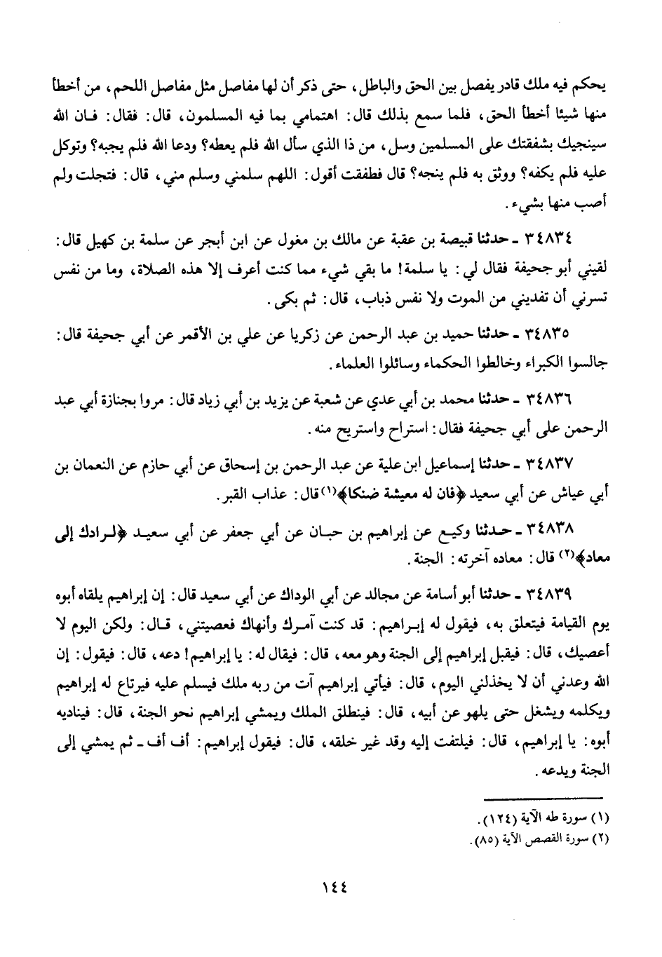 34839 - أَبُو أُسَامَةَ، عَنْ مُجَالِدٍ، عَنْ أَبِي الْوَدَّاكِ، عَنْ أَبِي سَعِيدٍ، قَالَ: " إِنَّ §إِبْرَاهِيمَ يَلْقَاهُ أَبُوهُ يَوْمَ الْقِيَامَةِ فَيَتَعَلَّقُ بِهِ، فَيَقُولُ لَهُ إِبْرَاهِيمُ: قَدْ كُنْتُ آمُرُكَ وَأَنْهَاكَ فَعَصَيْتَنِي، قَالَ: وَلَكِنَّ الْيَوْمَ لَا أَعْصِيكَ، قَالَ: فَيُقْبِلُ إِبْرَاهِيمُ إِلَى الْجَنَّةِ وَهُوَ مَعَهُ "، قَالَ: " فَيُقَالُ لَهُ: يَا إِبْرَاهِيمُ، دَعْهُ "، قَالَ: " فَيَقُولُ: إِنَّ اللَّهَ وَعَدَنِي أَنْ لَا يَخْذُلَنِي الْيَوْمَ "، قَالَ: «فَيَأْتِي إِبْرَاهِيمَ آتٍ مِنْ رَبِّهِ مَلَكٌ، فَيُسَلِّمُ عَلَيْهِ فَيَرْتَاعُ لَهُ إِبْرَاهِيمُ وَيُكَلِّمُهُ وَيُشْغَلُ حَتَّى يَلْهُوَ عَنْ أَبِيهِ»، قَالَ: «فَيَنْطَلِقُ الْمَلَكُ وَيَمْشِي إِبْرَاهِيمُ نَحْوَ الْجَنَّةِ»، قَالَ: " فَيُنَادِيهِ أَبُوهُ: يَا إِبْرَاهِيمُ "، قَالَ: «فَيَلْتَفِتُ إِلَيْهِ وَقَدْ غُيِّرَ خَلْقُهُ»، قَالَ: " فَيَقُولُ إِبْرَاهِيمُ: أُفٍّ أُفٍّ، ثُمَّ يَمْشِي إِلَى الْجَنَّةِ وَيَدَعُهُ "