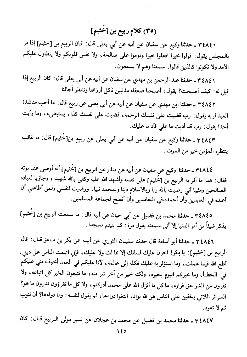 34840 - وَكِيعٌ، عَنْ سُفْيَانَ، عَنْ أَبِيهِ، عَنْ أَبِي يَعْلَى، قَالَ: كَانَ الرَّبِيعُ بْنُ خُثَيْمٍ إِذَا مَرَّ بِالْمَجْلِسِ يَقُولُ: " §قُولُوا خَيْرًا، وَافْعَلُوا خَيْرًا، وَدُومُوا عَلَى صَالِحَةٍ، وَلَا تَقْسُ قُلُوبُكُمْ، وَلَا يَتَطَاوَلْ عَلَيْكُمُ الْأَمَدُ، وَلَا تَكُونُوا كَالَّذِينَ قَالُوا: سَمِعْنَا وَهُمْ لَا يَسْمَعُونَ "