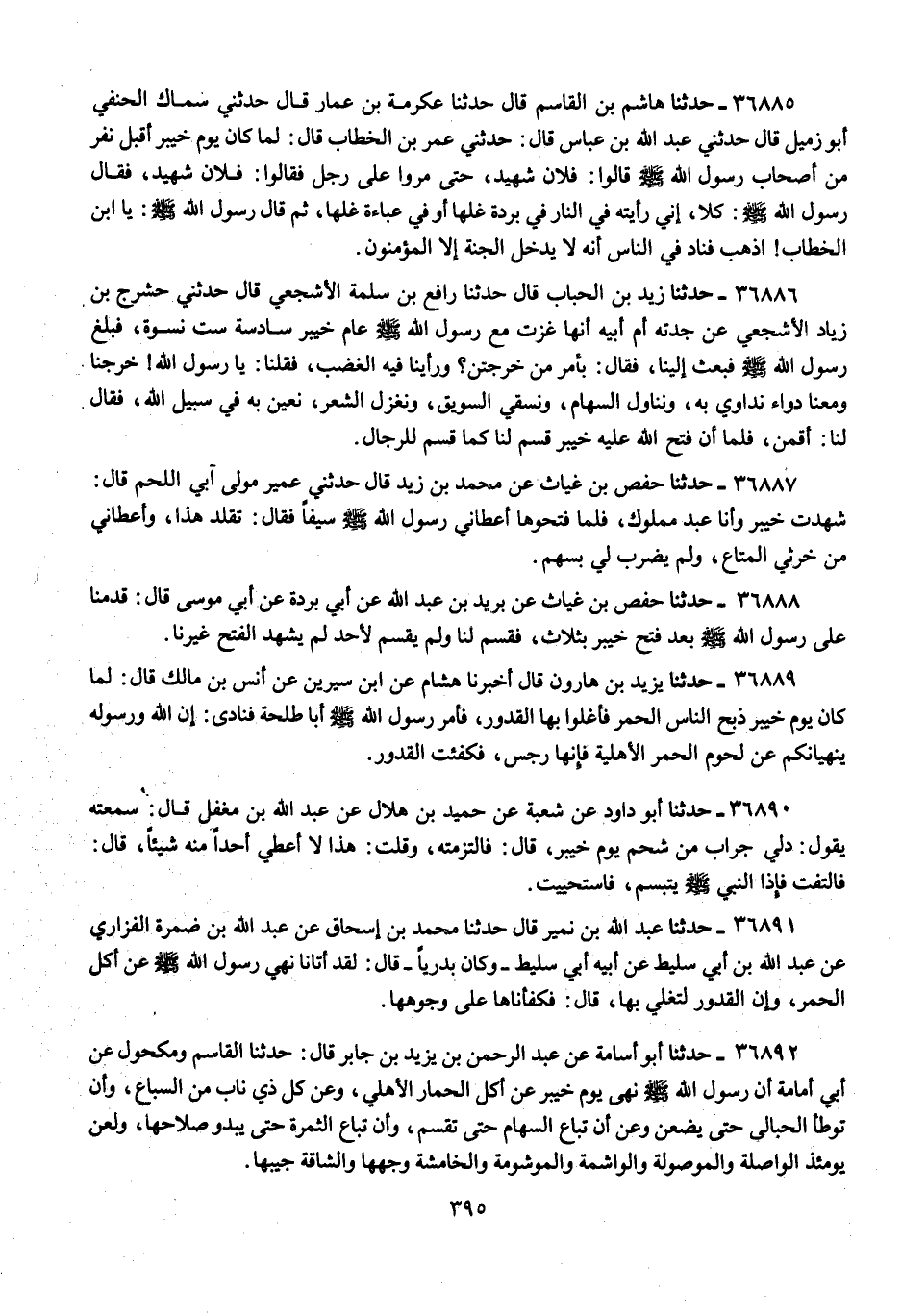 36889 - يَزِيدُ بْنُ هَارُونَ , قَالَ: أَخْبَرَنَا هِشَامٌ , عَنِ ابْنِ سِيرِينَ , عَنْ أَنَسِ بْنِ مَالِكٍ , قَالَ: " §لَمَّا كَانَ يَوْمُ خَيْبَرَ ذَبَحَ النَّاسُ الْحُمُرَ فَأَغْلُوا بِهَا الْقُدُورَ , فَأَمَرَ رَسُولُ اللَّهِ صَلَّى اللهُ عَلَيْهِ وَسَلَّمَ أَبَا طَلْحَةَ فَنَادَى: «إِنَّ اللَّهَ وَرَسُولَهُ يَنْهَيَانِكُمْ عَنْ لُحُومِ الْحُمُرِ الْأَهْلِيَّةِ فَإِنَّهَا رِجْسٌ , فَكُفِئَتِ الْقُدُورُ»
