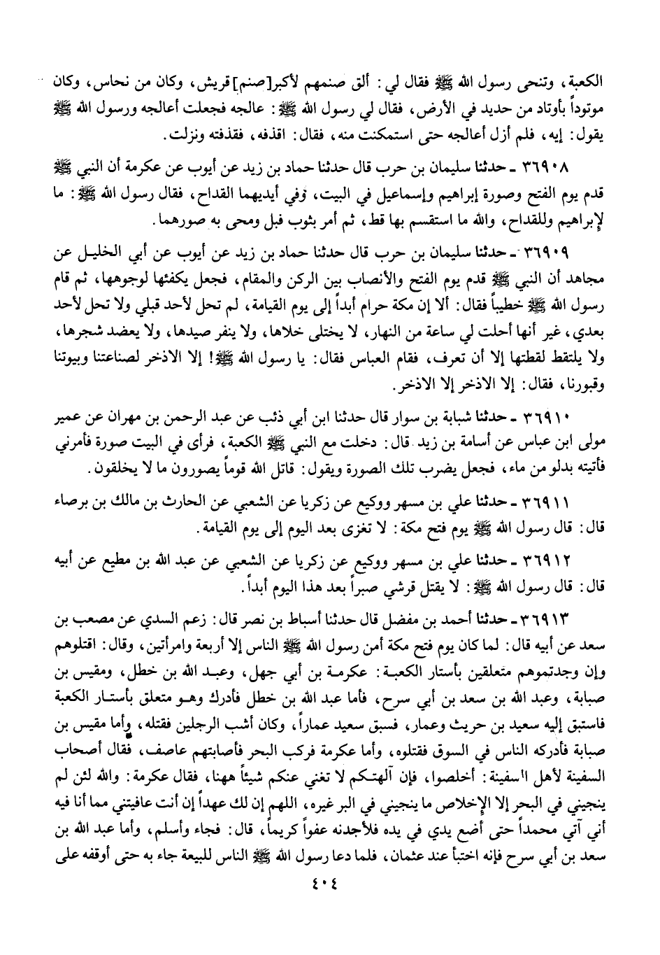 36909 - سُلَيْمَانُ بْنُ حَرْبٍ , قَالَ: حَدَّثَنَا حَمَّادُ بْنُ زَيْدٍ , عَنْ أَيُّوبَ , عَنْ أَبِي الْخَلِيلِ , عَنْ مُجَاهِدٍ , أَنَّ النَّبِيَّ صَلَّى اللهُ عَلَيْهِ وَسَلَّمَ قَدِمَ يَوْمَ الْفَتْحِ وَالْأَنْصَابُ بَيْنَ الرُّكْنِ وَالْمَقَامِ , فَجَعَلَ يُكَفِّئُهَا لِوُجُوهِهَا , ثُمَّ قَامَ رَسُولُ اللَّهِ صَلَّى اللهُ عَلَيْهِ وَسَلَّمَ خَطِيبًا فَقَالَ: «§أَلَا إِنَّ مَكَّةَ حَرَامٌ أَبَدًا إِلَى يَوْمِ الْقِيَامَةِ , لَمْ تَحِلَّ لِأَحَدٍ قَبْلِي، وَلَا تَحِلُّ لِأَحَدٍ بَعْدِي , غَيْرَ أَنَّهَا أُحِلَّتْ لِي سَاعَةً مِنَ النَّهَارِ , لَا يُخْتَلَى خَلَاهَا , وَلَا يُنَفَّرُ صَيْدُهَا , وَلَا يُعْضَدُ شَجَرُهَا , وَلَا يُلْتَقَطُ لُقَطَتُهَا إِلَّا أَنْ تُعَرَّفَ» , فَقَامَ الْعَبَّاسُ، فَقَالَ: يَا رَسُولَ اللَّهِ صَلَّى اللهُ عَلَيْهِ وَسَلَّمَ , إِلَّا الْإِذْخِرَ لِصِنَاعَتِنَا وَبُيُوتِنَا وَقُبُورِنَا , فَقَالَ: إِلَّا الْإِذْخِرَ إِلَّا الْإِذْخِرَ "