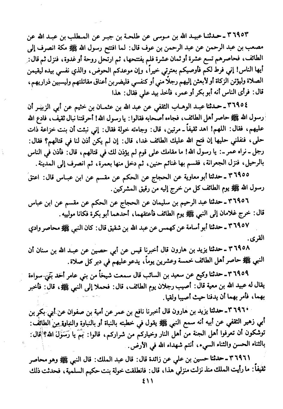 36958 - يَزِيدُ بْنُ هَارُونَ , قَالَ: أَخْبَرَنَا قَيْسٌ , عَنْ أَبِي حُصَيْنٍ , عَنْ عَبْدِ اللَّهِ بْنِ سِنَانٍ , أَنَّ النَّبِيَّ صَلَّى اللهُ عَلَيْهِ وَسَلَّمَ «§حَاصَرَ أَهْلَ الطَّائِفِ خَمْسَةً وَعِشْرِينَ يَوْمًا , يَدْعُو عَلَيْهِمْ فِي دُبُرِ كُلِّ صَلَاةٍ»