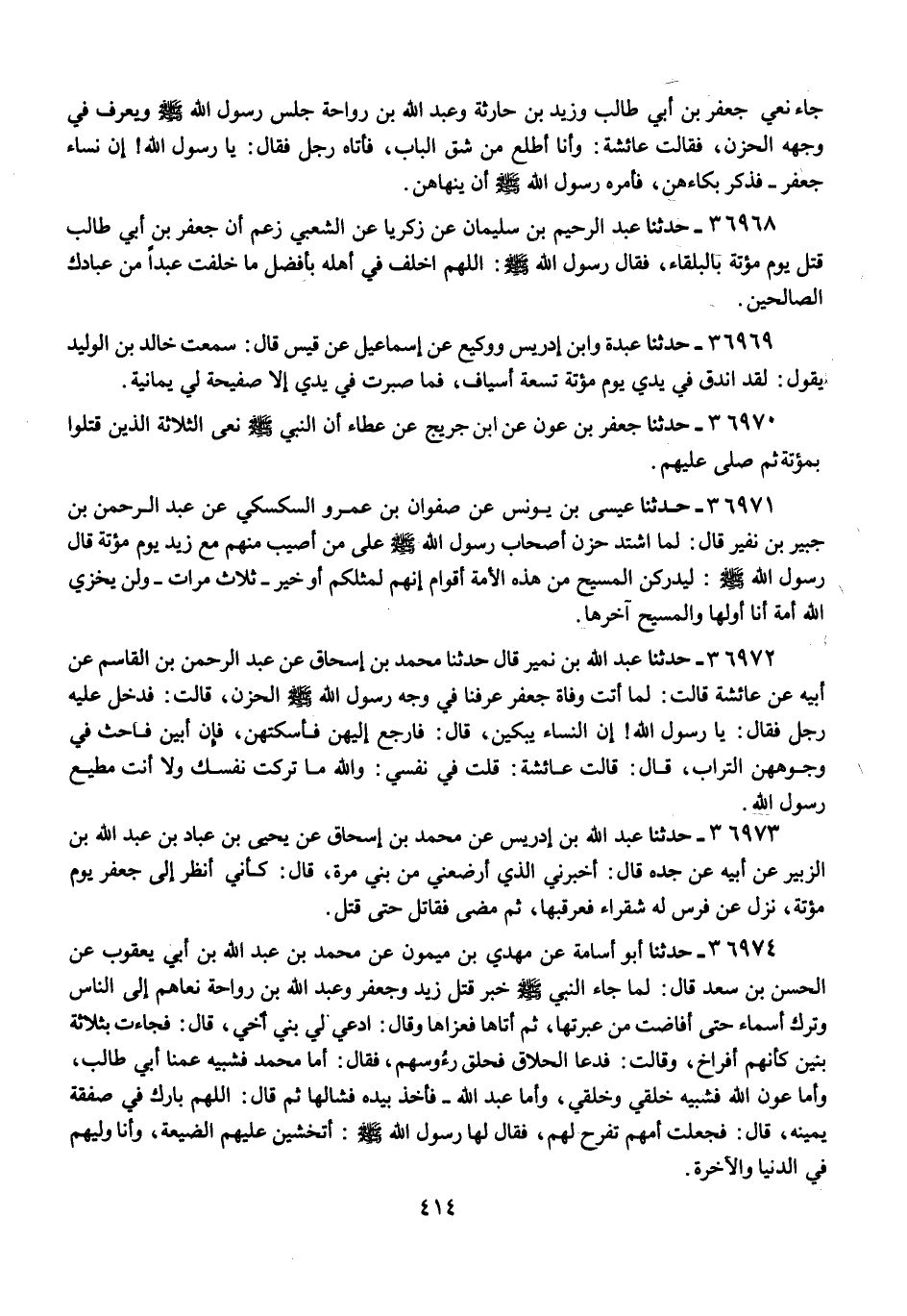 36973 - عَبْدُ اللَّهِ بْنُ إِدْرِيسَ , عَنْ مُحَمَّدِ بْنِ إِسْحَاقَ , عَنْ يَحْيَى بْنِ عَبَّادِ بْنِ عَبْدِ اللَّهِ بْنِ الزُّبَيْرِ , عَنْ أَبِيهِ , عَنْ جَدِّهِ , قَالَ: أَخْبَرَنِي الَّذِي أَرْضَعَنِي مِنْ بَنِي مُرَّةَ , قَالَ: «§كَأَنِّي , أَنْظُرُ إِلَى جَعْفَرٍ يَوْمَ مُؤْتَةَ , نَزَلَ عَنْ فَرَسٍ لَهُ شَقْرَاءَ فَعَرْقَبَهَا , ثُمَّ مَضَى فَقَاتَلَ حَتَّى قُتِلَ»
