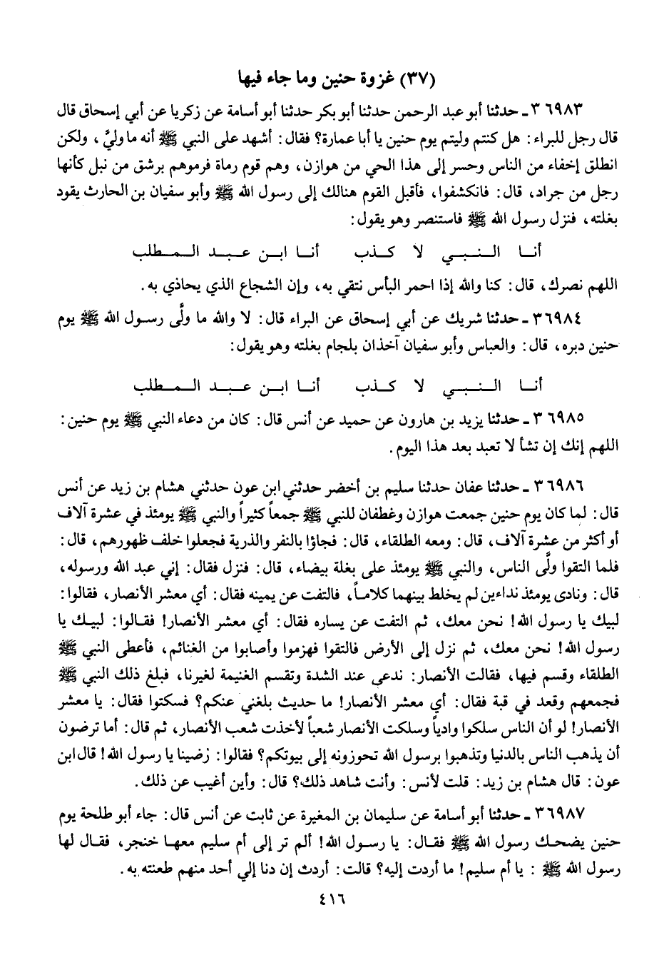 36983 - حَدَّثَنَا أَبُو أُسَامَةَ , عَنْ زَكَرِيَّا , عَنْ أَبِي إِسْحَاقَ , قَالَ: قَالَ رَجُلٌ لِلْبَرَاءِ: هَلْ كُنْتُمْ وَلَّيْتُمْ يَوْمَ حُنَيْنٍ يَا أَبَا عُمَارَةَ؟ فَقَالَ: أَشْهَدُ عَلَى النَّبِيِّ صَلَّى اللهُ عَلَيْهِ وَسَلَّمَ أَنَّهُ مَا وَلَّى , وَلَكِنَّهُ انْطَلَقَ أَخِفَّاءُ مِنَ النَّاسِ وَحُسَّرٌ إِلَى هَذَا الْحَيِّ مِنْ هَوَازِنَ , وَهُمْ قَوْمٌ رُمَاةٌ فَرَمَوْهُمْ بِرِشْقٍ مِنْ نَبْلٍ كَأَنَّهَا رِجْلٌ مِنْ جَرَادٍ , قَالَ: فَانْكَشَفُوا , §فَأَقْبَلَ الْقَوْمُ هُنَالِكَ إِلَى رَسُولِ اللَّهِ صَلَّى اللهُ عَلَيْهِ وَسَلَّمَ وَأَبُو سُفْيَانَ بْنُ الْحَارِثِ يَقُودُ بَغْلَتَهُ , فَنَزَلَ رَسُولُ اللَّهِ صَلَّى اللهُ عَلَيْهِ وَسَلَّمَ فَاسْتَنْصَرَ وَهُوَ يَقُولُ: «أَنَا النَّبِيُّ لَا كَذِبْ. أَنَا ابْنُ عَبْدِ الْمُطَّلِبْ. اللَّهُمَّ نَصْرُكَ» قَالَ: كُنَّا وَاللَّهِ إِذَا احْمَرَّ الْبَأْسُ نَتَّقِي بِهِ , وَإِنَّ الشُّجَاعَ الَّذِي يُحَاذِي بِهِ "
