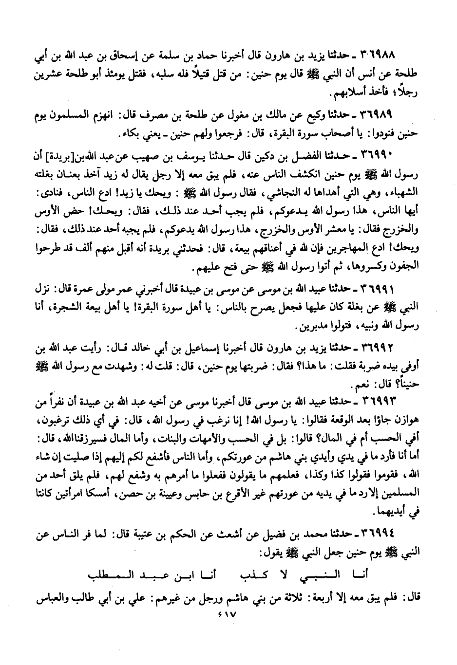 36994 - مُحَمَّدُ بْنُ فُضَيْلٍ , عَنْ أَشْعَثَ , عَنِ الْحَكَمِ بْنِ عُيَيْنَةَ , قَالَ: لَمَّا فَرَّ النَّاسُ عَنِ النَّبِيِّ صَلَّى اللهُ عَلَيْهِ وَسَلَّمَ يَوْمَ حُنَيْنٍ جَعَلَ النَّبِيُّ صَلَّى اللهُ عَلَيْهِ وَسَلَّمَ يَقُولُ: «§أَنَا النَّبِيُّ لَا كَذِبْ. أَنَا ابْنُ عَبْدِ الْمُطَّلِبْ». قَالَ: فَلَمْ يَبْقَ مَعَهُ إِلَّا أَرْبَعَةٌ: ثَلَاثَةٌ مِنْ بَنِي هَاشِمٍ وَرَجُلٌ مِنْ غَيْرِهِمْ: عَلِيُّ بْنُ أَبِي طَالِبٍ وَالْعَبَّاسُ -[418]- وَهُمَا بَيْنَ يَدَيْهِ وَأَبُو سُفْيَانَ بْنُ الْحَارِثِ آخِذٌ بِالْعَنَانِ، وَابْنُ مَسْعُودٍ مِنْ جَانِبِهِ الْأَيْسَرِ، قَالَ: فَلَيْسَ يُقْبِلُ نَحْوَهُ أَحَدٌ إِلَّا قُتِلَ، وَالْمُشْرِكُونَ حَوْلَهُ صَرْعَى بِحِسَابِ الْإِكْلِيلِ "