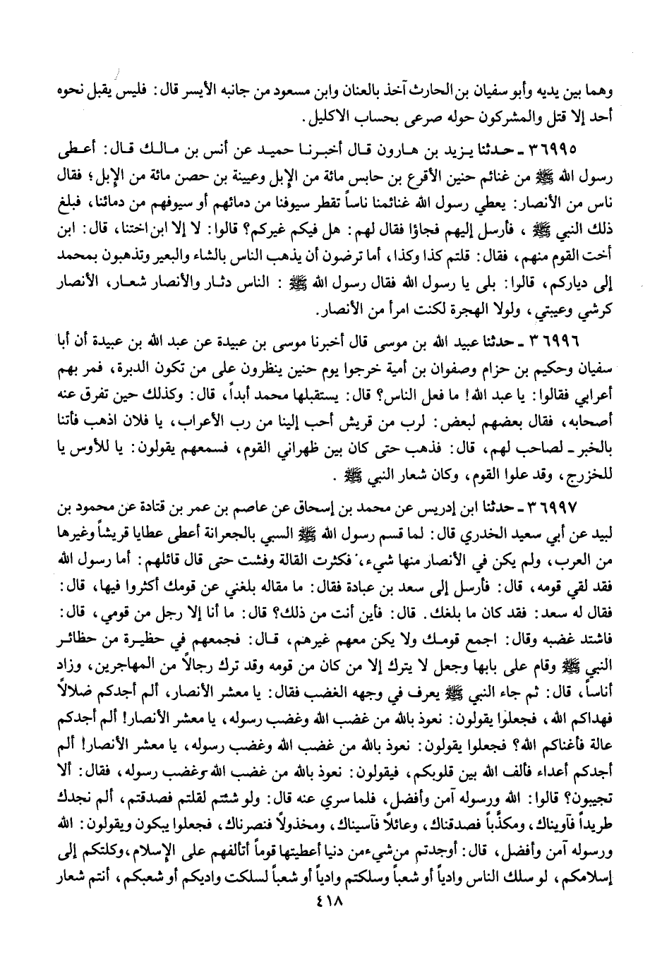 36997 - ابْنُ إِدْرِيسَ , عَنْ مُحَمَّدِ بْنِ إِسْحَاقَ , عَنْ عَاصِمِ بْنِ عُمَرَ بْنِ قَتَادَةَ , عَنْ مَحْمُودِ بْنِ لَبِيدٍ , عَنْ أَبِي سَعِيدٍ الْخُدْرِيِّ , قَالَ: لَمَّا قَسَّمَ رَسُولُ اللَّهِ صَلَّى اللهُ عَلَيْهِ وَسَلَّمَ السَّبْيَ بِالْجِعْرَانَةِ أَعْطَى عَطَايَا قُرَيْشًا وَغَيْرَهَا مِنَ الْعَرَبِ , وَلَمْ يَكُنْ فِي الْأَنْصَارِ مِنْهَا شَيْءٌ , فَكَثُرَتِ الْقَالَةُ وَفَشَتْ حَتَّى قَالَ قَائِلُهُمْ: أَمَّا رَسُولُ اللَّهِ فَقَدْ لَقِيَ قَوْمَهُ , قَالَ: فَأَرْسَلَ إِلَى سَعْدِ بْنِ عُبَادَةَ فَقَالَ: «مَا مَقَالَةٌ بَلَغَتْنِي عَنْ قَوْمِكَ أَكْثَرُوا فِيهَا» , قَالَ: فَقَالَ لَهُ سَعْدٌ: فَقَدْ كَانَ مَا بَلَغَكَ، قَالَ: فَأَيْنَ أَنْتَ مِنْ ذَلِكَ؟ قَالَ: مَا أَنَا إِلَّا رَجُلٌ مِنْ قَوْمِي , قَالَ: فَاشْتَدَّ غَضَبُهُ وَقَالَ: «اجْمَعْ قَوْمَكَ، وَلَا يَكُنْ مَعَهُمْ غَيْرُهُمْ» , قَالَ: فَجَمَعَهُمْ فِي حَظِيرَةٍ مِنْ حَظَائِرِ النَّبِيِّ صَلَّى اللهُ عَلَيْهِ وَسَلَّمَ وَقَامَ عَلَى بَابِهَا، وَجَعَلَ لَا يَتْرُكُ إِلَّا مَنْ كَانَ مِنْ قَوْمِهِ، وَقَدْ تَرَكَ رِجَالًا مِنَ الْمُهَاجِرِينَ , وَزَادَ أُنَاسًا , قَالَ: ثُمَّ جَاءَ النَّبِيُّ صَلَّى اللهُ عَلَيْهِ وَسَلَّمَ يُعْرَفُ فِي وَجْهِهِ الْغَضَبُ فَقَالَ: " يَا مَعْشَرَ الْأَنْصَارِ , §أَلَمْ أَجِدْكُمْ ضُلَّالًا فَهُدَاكُمُ اللَّهُ , فَجَعَلُوا يَقُولُونَ: نَعُوذُ بِاللَّهِ مِنْ غَضَبِ اللَّهِ وَغَضَبِ رَسُولِهِ , يَا مَعْشَرَ الْأَنْصَارِ , أَلَمْ أَجِدْكُمْ عَالَةً فَأَغْنَاكُمُ اللَّهُ؟ " فَجَعَلُوا يَقُولُونَ: نَعُوذُ بِاللَّهِ مِنْ غَضَبِ اللَّهِ وَغَضَبِ رَسُولِهِ , «يَا مَعْشَرَ الْأَنْصَارِ , أَلَمْ أَجِدْكُمْ أَعْدَاءً فَأَلَّفَ اللَّهُ بَيْنَ قُلُوبِكُمْ» , فَيَقُولُونَ: نَعُوذُ بِاللَّهِ مِنْ غَضَبِ اللَّهِ وَغَضَبِ رَسُولِهِ , فَقَالَ: أَلَا تُجِيبُونَ؟ قَالُوا: اللَّهُ وَرَسُولُهُ أَمَنُّ وَأَفْضَلُ , فَلَمَّا سُرِّيَ عَنْهُ قَالَ: " وَلَوْ شِئْتُمْ لَقُلْتُمْ فَصَدَقْتُمْ: أَلَمْ نَجِدْكَ طَرِيدًا فَآوَيْنَاكَ , وَمُكَذَّبًا فَصَدَّقْنَاكَ , وَعَائِلًا فَآسَيْنَاكَ , وَمَخْذُولًا فَنَصَرْنَاكَ " , فَجَعَلُوا يَبْكُونَ وَيَقُولُونَ: اللَّهُ وَرَسُولُهُ أَمَنُّ وَأَفْضَلُ , قَالَ: «أَوَجَدْتُمْ مِنْ شَيْءٍ مِنْ دُنْيَا أَعْطَيْتُهَا قَوْمًا أَتَأَلَّفُهُمْ عَلَى الْإِسْلَامِ، وَوَكَلْتُكُمْ إِلَى إِسْلَامِكُمْ , لَوْ سَلَكَ النَّاسُ وَادِيًا أَوْ شِعْبًا وَسَلَكْتُمْ وَادِيًا أَوْ شِعْبًا لَسَلَكْتُ وَادِيَكُمْ أَوْ شِعْبَكُمْ , أَنْتُمْ شِعَارٌ -[419]- وَالنَّاسُ دِثَارٌ , وَلَوْلَا الْهِجْرَةُ لَكُنْتُ امْرَأً مِنَ الْأَنْصَارِ» , ثُمَّ رَفَعَ يَدَيْهِ حَتَّى إِنِّي لَأَرَى مَا تَحْتَ مَنْكِبَيْهِ فَقَالَ: «اللَّهُمَّ اغْفِرْ لِلْأَنْصَارِ وَلِأَبْنَاءِ الْأَنْصَارِ وَلِأَبْنَاءِ أَبْنَاءِ الْأَنْصَارِ , أَمَّا تَرْضَوْنَ أَنْ يَذْهَبَ النَّاسُ بِالشَّاةِ وَالْبَعِيرِ , وَتَذْهَبُونَ بِرَسُولِ اللَّهِ إِلَى بُيُوتِكُمْ؟» فَبَكَى الْقَوْمُ حَتَّى أَخْضَلُوا لِحَاهُمْ , وَانْصَرَفُوا وَهُمْ يَقُولُونَ: رَضِينَا بِاللَّهِ رَبًّا، وَبِرَسُولِهِ حَظًّا وَنَصِيبًا "