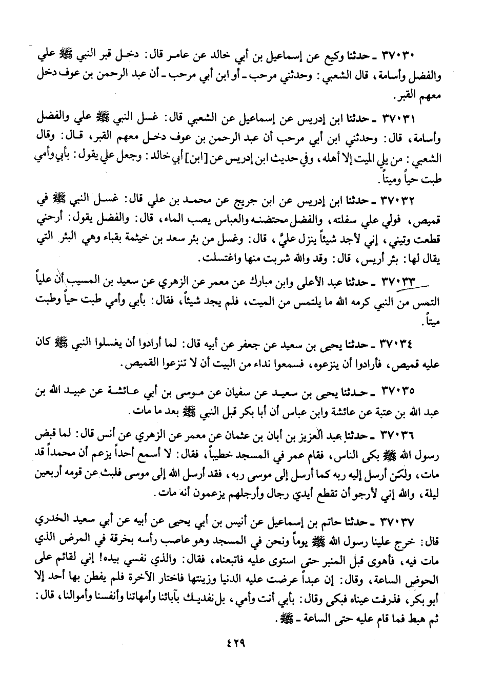 37034 - يَحْيَى بْنُ سَعِيدٍ , عَنْ جَعْفَرٍ , عَنْ أَبِيهِ , قَالَ: لَمَّا §أَرَادُوا أَنْ يُغَسِّلُوا النَّبِيَّ , صَلَّى اللهُ عَلَيْهِ وَسَلَّمَ " كَانَ عَلَيْهِ قَمِيصٌ , فَأَرَادُوا أَنْ يَنْزِعُوهُ , فَسَمِعُوا نِدَاءً مِنَ الْبَيْتِ: أَنْ لَا تَنْزِعُوا الْقَمِيصَ "