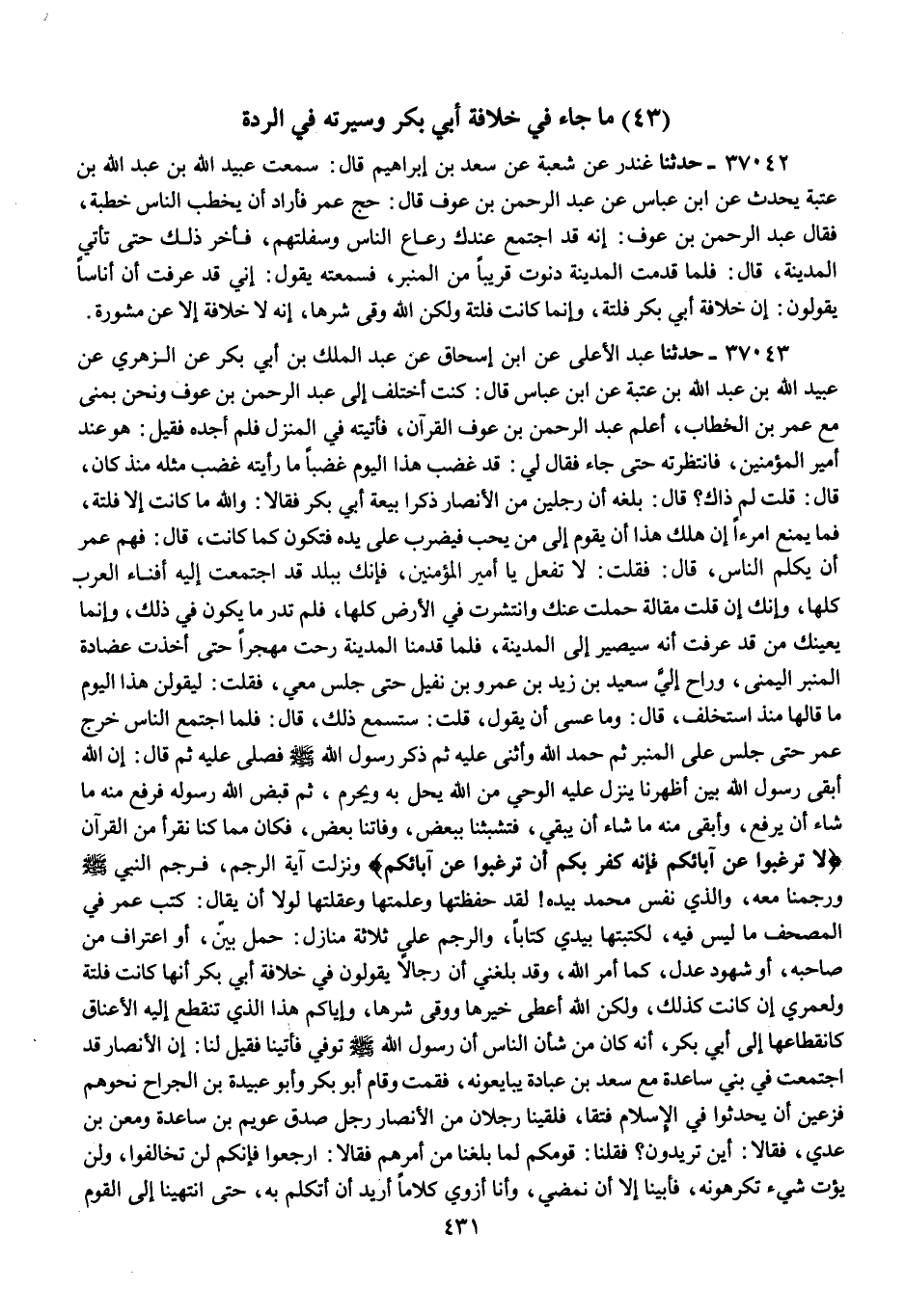 37043 - عَبْدُ الْأَعْلَى , عَنِ ابْنِ إِسْحَاقَ , عَنْ عَبْدِ الْمَلِكِ بْنِ أَبِي بَكْرٍ , عَنِ الزُّهْرِيِّ , عَنْ عُبَيْدِ اللَّهِ بْنِ عَبْدِ اللَّهِ بْنِ عُتْبَةَ , عَنِ ابْنِ عَبَّاسٍ , قَالَ: §كُنْتُ أَخْتَلِفُ إِلَى عَبْدِ الرَّحْمَنِ بْنِ عَوْفٍ وَنَحْنُ بِمِنًى مَعَ عُمَرَ بْنِ الْخَطَّابِ , أُعَلِّمُ عَبْدَ الرَّحْمَنِ بْنَ عَوْفٍ الْقُرْآنَ , فَأَتَيْتُهُ فِي الْمَنْزِلِ فَلَمْ أَجِدْهُ فَقِيلَ: هُوَ عِنْدَ أَمِيرِ الْمُؤْمِنِينَ , فَانْتَظَرْتُهُ حَتَّى جَاءَ فَقَالَ لِي: قَدْ غَضِبَ هَذَا الْيَوْمَ غَضَبًا مَا رَأَيْتُهُ غَضِبَ مِثْلَهُ مُنْذُ كَانَ , قَالَ: قُلْتُ لِمَ ذَاكَ؟ قَالَ: بَلَغَهُ أَنَّ رَجُلَيْنِ مِنَ الْأَنْصَارِ ذَكَرَا بَيْعَةَ أَبِي بَكْرٍ فَقَالَا: وَاللَّهِ مَا كَانَتْ إِلَّا فَلْتَةً , فَمَا يَمْنَعُ امْرَأً إِنْ هَلَكَ هَذَا أَنْ يَقُومَ إِلَى مَنْ يُحِبُّ فَيَضْرِبَ عَلَى يَدِهِ فَتَكُونَ كَمَا كَانَتْ ; قَالَ: فَهَمَّ عُمَرُ أَنْ يُكَلِّمَ النَّاسَ , قَالَ: فَقُلْتُ: لَا تَفْعَلْ يَا أَمِيرَ الْمُؤْمِنِينَ , فَإِنَّكَ بِبَلَدٍ قَدِ اجْتَمَعَتْ إِلَيْهِ أَفْنَاءُ الْعَرَبِ كُلُّهَا , وَإِنَّكَ إِنْ قُلْتَ مَقَالَةً حُمِلَتْ عَنْكَ وَانْتَشَرَتْ فِي الْأَرْضِ كُلِّهَا , فَلَمْ تَدْرِ مَا يَكُونُ فِي ذَلِكَ , وَإِنَّمَا يُعِينُكَ مَنْ قَدْ عَرَفْتَ أَنَّهُ سَيَصِيرُ إِلَى الْمَدِينَةِ , فَلَمَّا قَدِمْنَا الْمَدِينَةَ رُحْتُ مُهَجِّرًا حَتَّى أَخَذْتُ عِضَادَةَ الْمِنْبَرِ الْيُمْنَى , وَرَاحَ إِلَيَّ سَعِيدُ بْنُ زَيْدِ بْنِ عَمْرِو بْنِ نُفَيْلٍ حَتَّى جَلَسَ مَعِي , فَقُلْتُ: لَيَقُولَنَّ هَذَا الْيَوْمَ مَقَالَةً مَا قَالَهَا مُنْذُ اسْتُخْلِفَ , قَالَ: وَمَا عَسَى أَنْ يَقُولَ , قُلْتُ: سَتَسْمَعُ ذَلِكَ , قَالَ: فَلَمَّا اجْتَمَعَ النَّاسُ خَرَجَ عُمَرُ حَتَّى جَلَسَ عَلَى الْمِنْبَرِ ثُمَّ حَمِدَ اللَّهَ وَأَثْنَى عَلَيْهِ ثُمَّ ذَكَرَ رَسُولَ اللَّهِ صَلَّى اللهُ عَلَيْهِ وَسَلَّمَ فَصَلَّى عَلَيْهِ، ثُمَّ قَالَ: إِنَّ اللَّهَ أَبْقَى رَسُولَهُ بَيْنَ أَظْهُرِنَا يَنْزِلُ عَلَيْهِ الْوَحْيُ مِنَ اللَّهِ يُحِلُّ بِهِ وَيُحَرِّمُ , ثُمَّ قَبَضَ اللَّهُ رَسُولَهُ فَرَفَعَ مِنْهُ مَا شَاءَ أَنْ يَرْفَعَ , وَأَبْقَى مِنْهُ مَا شَاءَ أَنْ يُبْقِيَ , فَتَشَبَّثْنَا بِبَعْضٍ , وَفَاتَنَا بَعْضٌ , فَكَانَ مِمَّا كُنَّا نَقْرَأُ مِنَ الْقُرْآنِ «لَا تَرْغَبُوا عَنْ آبَائِكُمْ، فَإِنَّهُ كُفْرٌ بِكُمْ أَنْ تَرْغَبُوا عَنْ آبَائِكُمْ» وَنَزَلَتْ آيَةُ الرَّجْمِ , فَرَجَمَ النَّبِيُّ صَلَّى اللهُ عَلَيْهِ وَسَلَّمَ وَرَجَمْنَا مَعَهُ , وَالَّذِي نَفْسُ مُحَمَّدٍ بِيَدِهِ , لَقَدْ حَفِظْتُهَا وَعَلِمْتُهَا وَعَقَلْتُهَا، لَوْلَا أَنْ يُقَالَ: كَتَبَ عُمَرُ فِي الْمُصْحَفِ مَا لَيْسَ فِيهِ , لَكَتَبْتُهَا بِيَدِي كِتَابًا , وَالرَّجْمُ عَلَى ثَلَاثَةِ مَنَازِلَ: حَمْلٌ بَيِّنٌ , أَوِ اعْتِرَافٌ مِنْ صَاحِبِهِ , أَوْ شُهُودٌ عَدْلٌ , كَمَا أَمَرَ اللَّهُ , وَقَدْ بَلَغَنِي أَنَّ رِجَالًا يَقُولُونَ فِي خِلَافَةِ أَبِي بَكْرٍ: إِنَّهَا كَانَتْ فَلْتَةً، وَلَعَمْرِي إِنْ كَانَتْ كَذَلِكَ , وَلَكِنَّ اللَّهَ أَعْطَى خَيْرَهَا وَوَقَى شَرَّهَا ; وَإِيَّاكُمْ هَذَا الَّذِي تَنْقَطِعُ إِلَيْهِ الْأَعْنَاقُ كَانْقِطَاعِهَا إِلَى أَبِي بَكْرٍ , إِنَّهُ كَانَ مِنْ شَأْنِ النَّاسِ أَنَّ رَسُولَ اللَّهِ صَلَّى اللهُ عَلَيْهِ وَسَلَّمَ تُوُفِّيَ فَأَتَيْنَا فَقِيلَ لَنَا: إِنَّ الْأَنْصَارَ قَدِ اجْتَمَعَتْ فِي سَقِيفَةِ بَنِي سَاعِدَةَ مَعَ سَعْدِ بْنِ عُبَادَةَ يُبَايِعُونَهُ , فَقُمْتُ وَقَامَ أَبُو بَكْرٍ وَأَبُو عُبَيْدَةَ بْنُ الْجَرَّاحِ نَحْوَهُمْ فَزِعِينَ أَنْ يُحْد