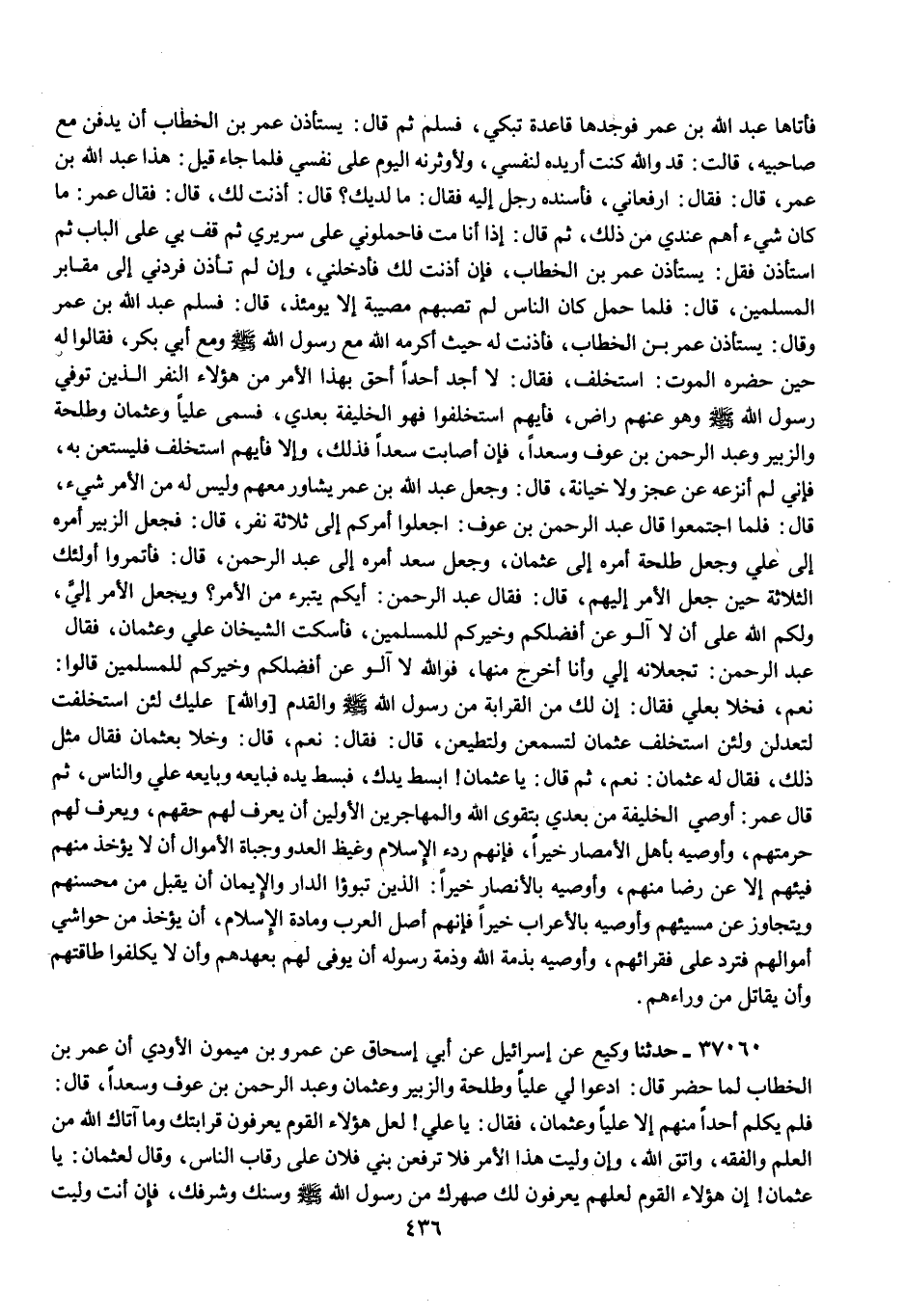 37060 - وَكِيعٌ , عَنْ إِسْرَائِيلَ , عَنْ أَبِي إِسْحَاقَ , عَنْ عَمْرِو بْنِ مَيْمُونٍ الْأَوْدِيِّ , أَنَّ عُمَرَ بْنَ الْخَطَّابِ , لَمَّا حُضِرَ قَالَ: " §ادْعُوا لِي عَلِيًّا وَطَلْحَةَ وَالزُّبَيْرَ وَعُثْمَانَ وَعَبْدَ الرَّحْمَنِ بْنَ عَوْفٍ وَسَعْدًا , قَالَ: فَلَمْ يُكَلِّمْ أَحَدًا مِنْهُمْ إِلَّا عَلِيًّا وَعُثْمَانَ , فَقَالَ: يَا عَلِيُّ , لَعَلَّ هَؤُلَاءِ الْقَوْمَ يَعْرِفُونَ قَرَابَتَكَ وَمَا آتَاكَ اللَّهُ مِنَ الْعِلْمِ وَالْفِقْهِ , وَاتَّقِ اللَّهَ , وَإِنْ وُلِّيتَ هَذَا الْأَمْرَ , فَلَا تَرْفَعَنَّ بَنِي فُلَانٍ عَلَى رِقَابِ النَّاسِ , وَقَالَ لِعُثْمَانَ: يَا عُثْمَانُ , إِنَّ هَؤُلَاءِ الْقَوْمَ لَعَلَّهُمْ يَعْرِفُونَ لَكَ صِهْرَكَ مِنْ رَسُولِ اللَّهِ صَلَّى اللهُ عَلَيْهِ وَسَلَّمَ وَسِنَّكَ وَشَرَفَكَ , فَإِنْ أَنْتَ وُلِّيتَ -[437]- هَذَا الْأَمْرَ فَاتَّقِ اللَّهَ , وَلَا تَرْفَعْ بَنِي فُلَانٍ عَلَى رِقَابِ النَّاسِ , فَقَالَ: ادْعُوا لِي صُهَيْبًا , فَقَالَ: صَلِّ بِالنَّاسِ ثَلَاثًا , وَلْيَجْتَمِعْ هَؤُلَاءِ الرَّهْطُ فَلِيَخْلُوا , فَإِنْ أَجْمَعُوا عَلَى رَجُلٍ فَاضْرِبُوا رَأْسَ مَنْ خَالَفَهُمْ "
