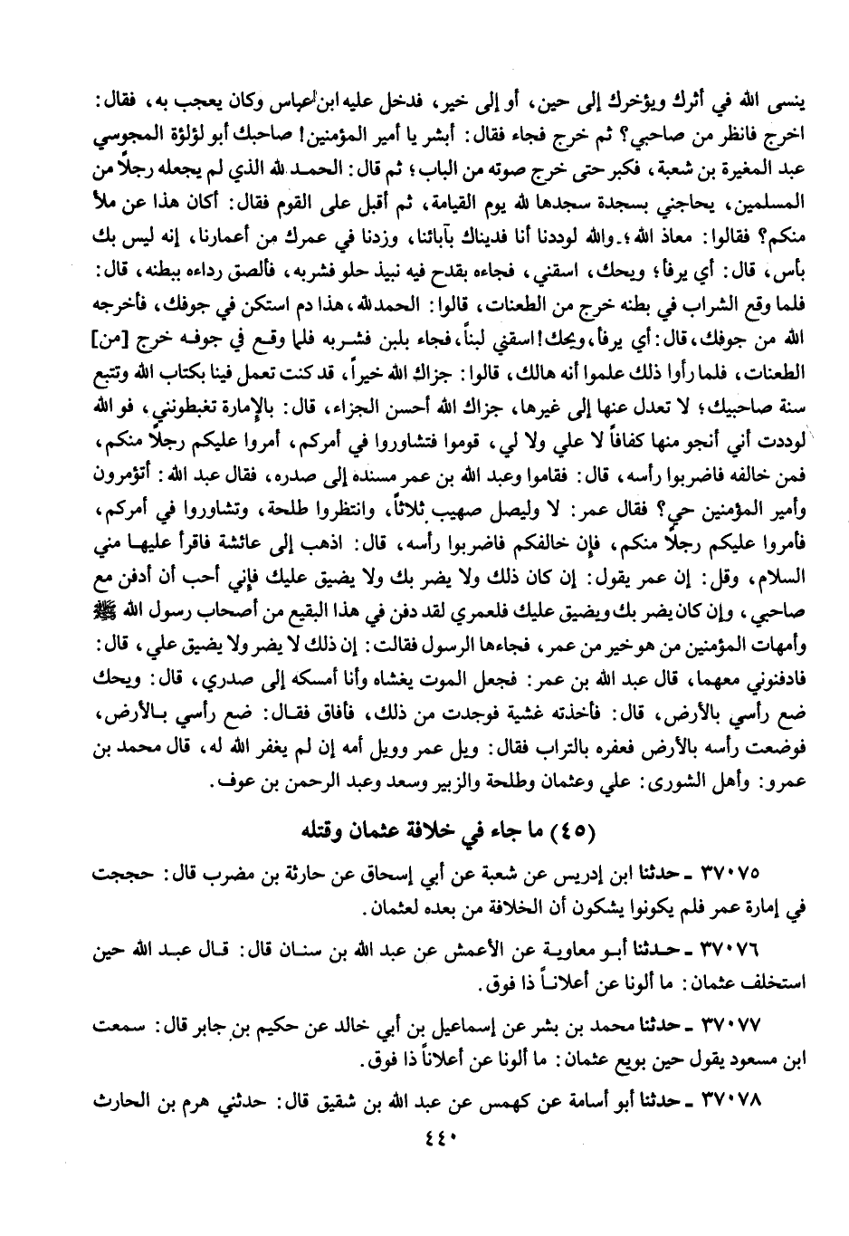 37075 - ابْنُ إِدْرِيسَ , عَنْ شُعْبَةَ , عَنْ أَبِي إِسْحَاقَ , عَنْ حَارِثَةَ بْنِ مُضَرِّبٍ , قَالَ: «§حَجَجْتُ فِي إِمَارَةِ عُمَرَ فَلَمْ يَكُونُوا يَشْكُونَ أَنَّ الْخِلَافَةَ مِنْ بَعْدِهِ لِعُثْمَانَ»