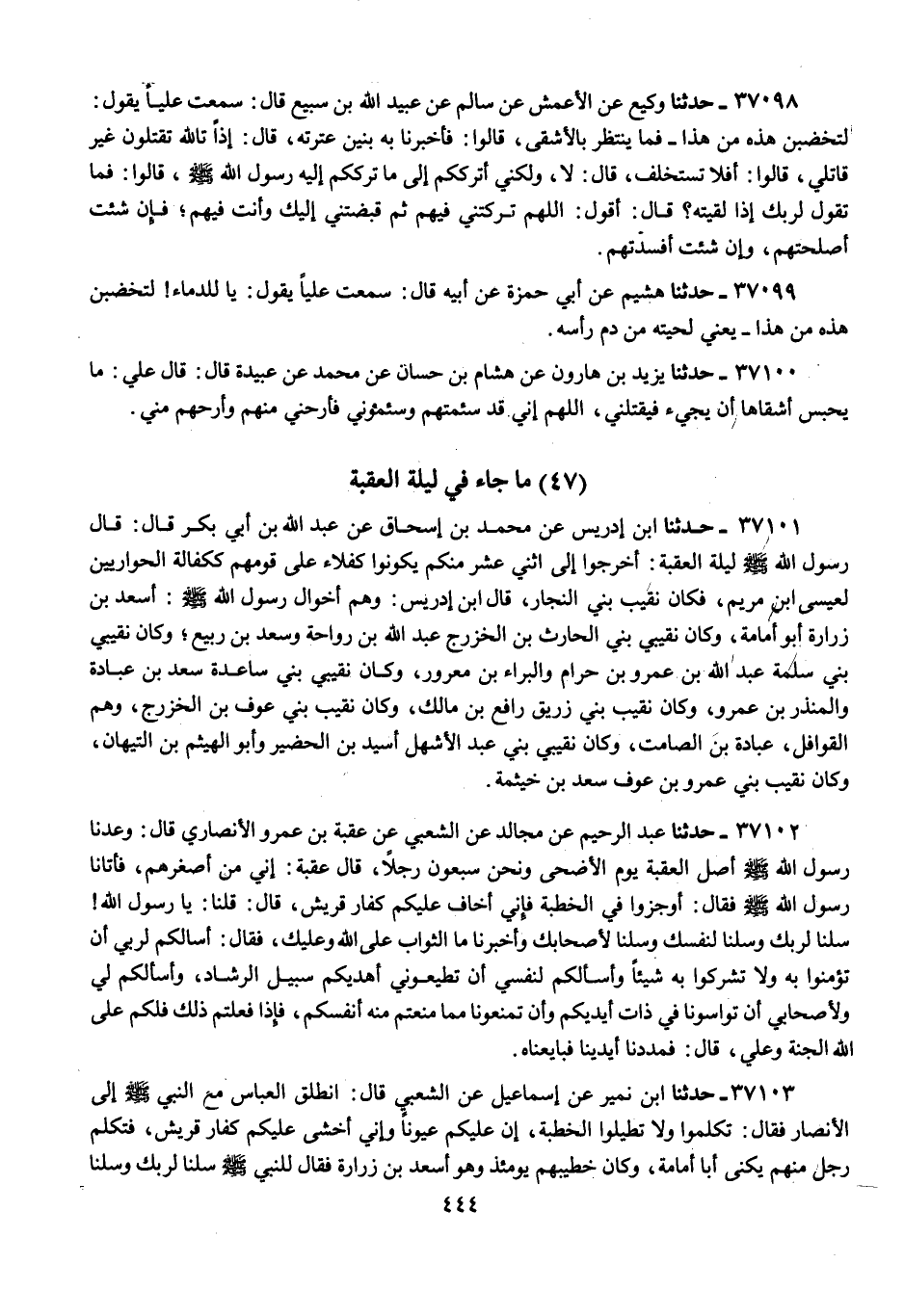 37102 - عَبْدُ الرَّحِيمِ، عَنْ مُجَالِدٍ، عَنِ الشَّعْبِيِّ، عَنْ عُقْبَةَ بْنِ عَمْرٍو الْأَنْصَارِيِّ، قَالَ: وَعَدَنَا رَسُولُ اللَّهِ صَلَّى اللهُ عَلَيْهِ وَسَلَّمَ أَصْلَ الْعَقَبَةِ يَوْمَ الْأَضْحَى وَنَحْنُ سَبْعُونَ رَجُلًا، قَالَ عُقْبَةُ: إِنِّي مِنْ أَصْغَرِهِمْ , فَأَتَانَا رَسُولُ اللَّهِ صَلَّى اللهُ عَلَيْهِ وَسَلَّمَ فَقَالَ: «أَوْجِزُوا فِي الْخُطْبَةِ فَإِنِّي أَخَافُ عَلَيْكُمْ كُفَّارَ قُرَيْشٍ» , قَالَ: قُلْنَا: يَا رَسُولَ اللَّهِ , سَلْنَا لِرَبِّكَ، وَسَلْنَا لِنَفْسِكَ، وَسَلْنَا لِأَصْحَابِكَ، وَأَخْبِرْنَا مَا الثَّوَابُ عَلَى اللَّهِ وَعَلَيْكَ , فَقَالَ: «§أَسْأَلُكُمْ لِرَبِّي أَنْ تُؤْمِنُوا بِهِ وَلَا تُشْرِكُوا بِهِ شَيْئًا، وَأَسْأَلُكُمْ لِنَفْسِي أَنْ تُطِيعُونِي أَهْدِيكُمْ سَبِيلَ الرَّشَادِ , وَأَسْأَلُكُمْ لِي وَلِأَصْحَابِي أَنْ تُوَاسُونَا فِي ذَاتِ أَيْدِيكُمْ، وَأَنْ تَمْنَعُونَا مِمَّا مَنَعْتُمْ مِنْهُ أَنْفُسَكُمْ , فَإِذَا فَعَلْتُمْ ذَلِكَ فَلَكُمْ عَلَى اللَّهِ الْجَنَّةُ وَعَلَيَّ» قَالَ: فَمَدَدْنَا أَيْدِيَنَا فَبَايَعْنَاهُ