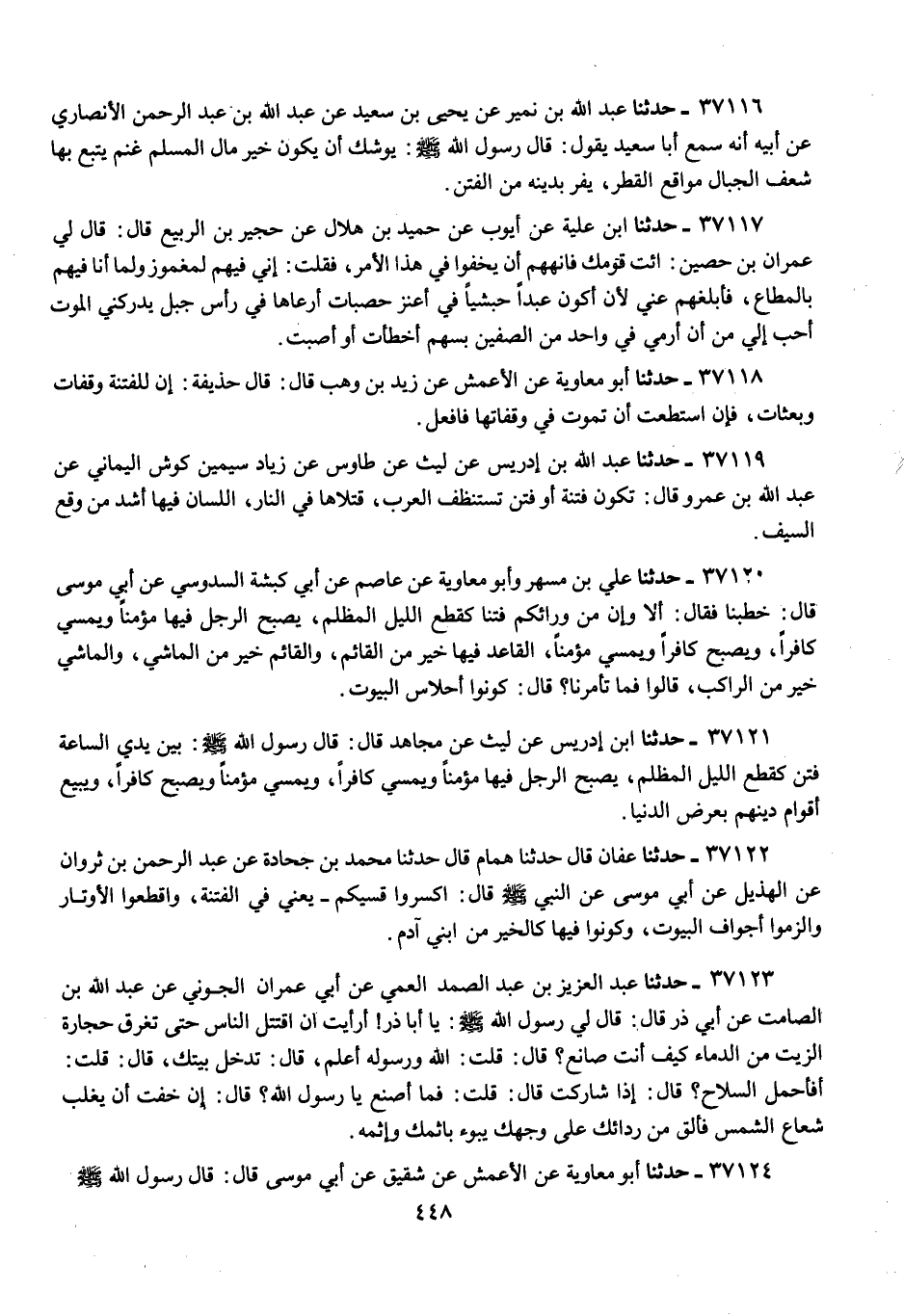 37123 - عَبْدُ الْعَزِيزِ بْنُ عَبْدِ الصَّمَدِ الْعَمِّيُّ، عَنْ أَبِي عِمْرَانَ الْجَوْنِيِّ، عَنْ عَبْدِ اللَّهِ بْنِ الصَّامِتِ، عَنْ أَبِي ذَرٍّ، قَالَ: قَالَ لِي رَسُولُ اللَّهِ صَلَّى اللهُ عَلَيْهِ وَسَلَّمَ: «يَا أَبَا ذَرٍّ , أَرَأَيْتَ §إِنِ اقْتَتَلَ النَّاسُ حَتَّى تَغْرَقَ حِجَارَةُ الزَّيْتِ مِنَ الدِّمَاءِ كَيْفَ أَنْتَ صَانِعٌ؟» قَالَ: قُلْتُ: اللَّهُ وَرَسُولُهُ أَعْلَمُ , قَالَ: «تَدْخُلُ بَيْتَكَ» , قَالَ: قُلْتُ: أَفَأَحْمِلُ السِّلَاحَ؟ قَالَ: «إِذًا شَارَكْتَ» , قَالَ: قُلْتُ: فَمَا أَصْنَعُ يَا رَسُولَ اللَّهِ؟ قَالَ: «إِنْ خِفْتَ أَنْ يَغْلِبَ شُعَاعُ الشَّمْسِ فَأَلْقِ مِنْ رِدَائِكَ عَلَى وَجْهِكَ يَبُوءُ بِإِثْمِكَ وَإِثْمِهِ»