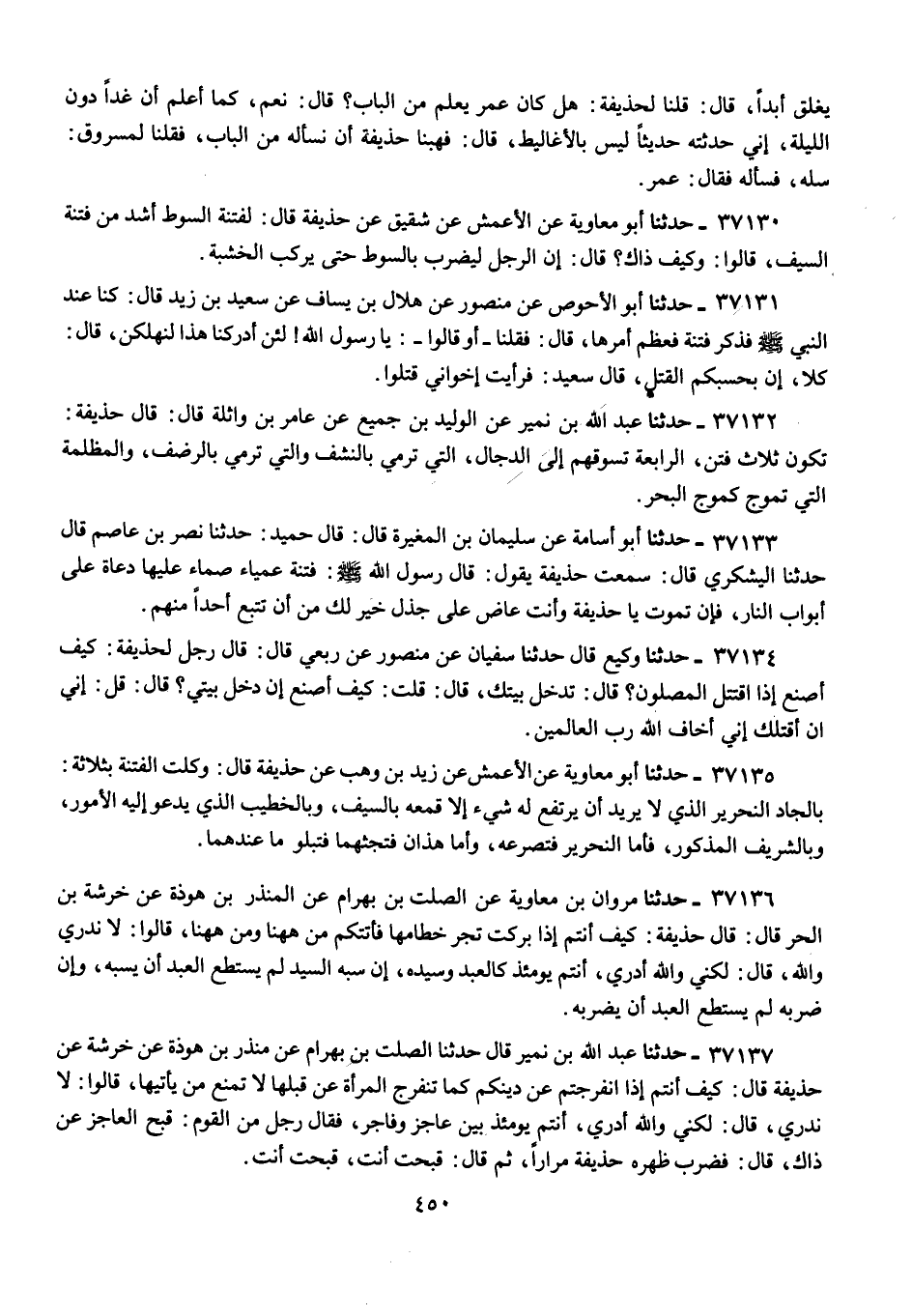 37138 - عَبْدُ اللَّهِ بْنُ نُمَيْرٍ، قَالَ حَدَّثَنَا الصَّلْتُ بْنُ بَهْرَامُ، قَالَ أَخْبَرَنَا الْمُنْذِرُ بْنُ هَوْذَةَ، عَنْ خَرَشَةَ، أَنَّ حُذَيْفَةَ، دَخَلَ الْمَسْجِدَ , فَمَرَّ عَلَى قَوْمٍ يُقْرِئُ بَعْضُهُمْ بَعْضًا , فَقَالَ: «إِنْ تَكُونُوا عَلَى الطَّرِيقَةِ , لَقَدْ سَبَقْتُمْ سَبْقًا بَعِيدًا , وَإِنْ تَدَعُوهُ فَقَدْ ضَلَلْتُمْ» , قَالَ: ثُمَّ جَلَسَ إِلَى حَلْقَةٍ , فَقَالَ: «إِنَّا كُنَّا قَوْمًا آمَنَّا قَبْلَ أَنْ نَقْرَأَ , وَإِنَّ قَوْمًا سَيَقْرَءُونَ قَبْلَ أَنْ يُؤْمِنُوا ,» فَقَالَ رَجُلٌ مِنَ الْقَوْمِ: تِلْكَ الْفِتْنَةُ , قَالَ: أَجَلْ , " قَدْ §أَتَتْكُمْ مِنْ أَمَامِكُمْ حَيْثُ تَسُوءُ وُجُوهَكُمْ ثُمَّ لَتَأْتِيَنَّكُمْ دِيَمًا دِيَمًا , إِنَّ الرَّجُلَ لَيَرْجِعُ فَيَأْتَمِرُ الْأَمْرَيْنِ: أَحَدُهُمَا عَجْزٌ وَالْآخَرُ فُجُورٌ " , قَالَ خَرَشَةُ: فَمَا بَرِحْتُ إِلَّا قَلِيلًا حَتَّى رَأَيْتَ الرَّجُلَ يَخْرُجُ بِسَيْفِهِ يَسْتَعْرِضُ النَّاسَ