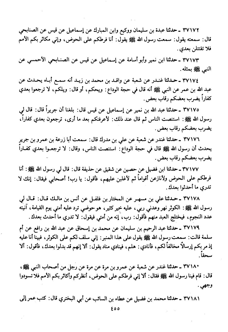 37175 - عَبْدُ اللَّهِ بْنُ نُمَيْرٍ، عَنْ إِسْمَاعِيلَ، عَنْ قَيْسٍ، قَالَ: بَلَغَنَا أَنَّ جَرِيرًا، قَالَ: قَالَ لِي رَسُولُ اللَّهِ صَلَّى اللهُ عَلَيْهِ وَسَلَّمَ: «اسْتَنْصِتِ النَّاسَ» ثُمَّ قَالَ عِنْدَ ذَلِكَ: لَأُعَرِّفَنَّكُمْ بَعْدُ مَا أَرَى , §تَرْجِعُونَ بَعْدِي كُفَّارًا , يَضْرِبُ بَعْضُكُمْ رِقَابَ بَعْضٍ "