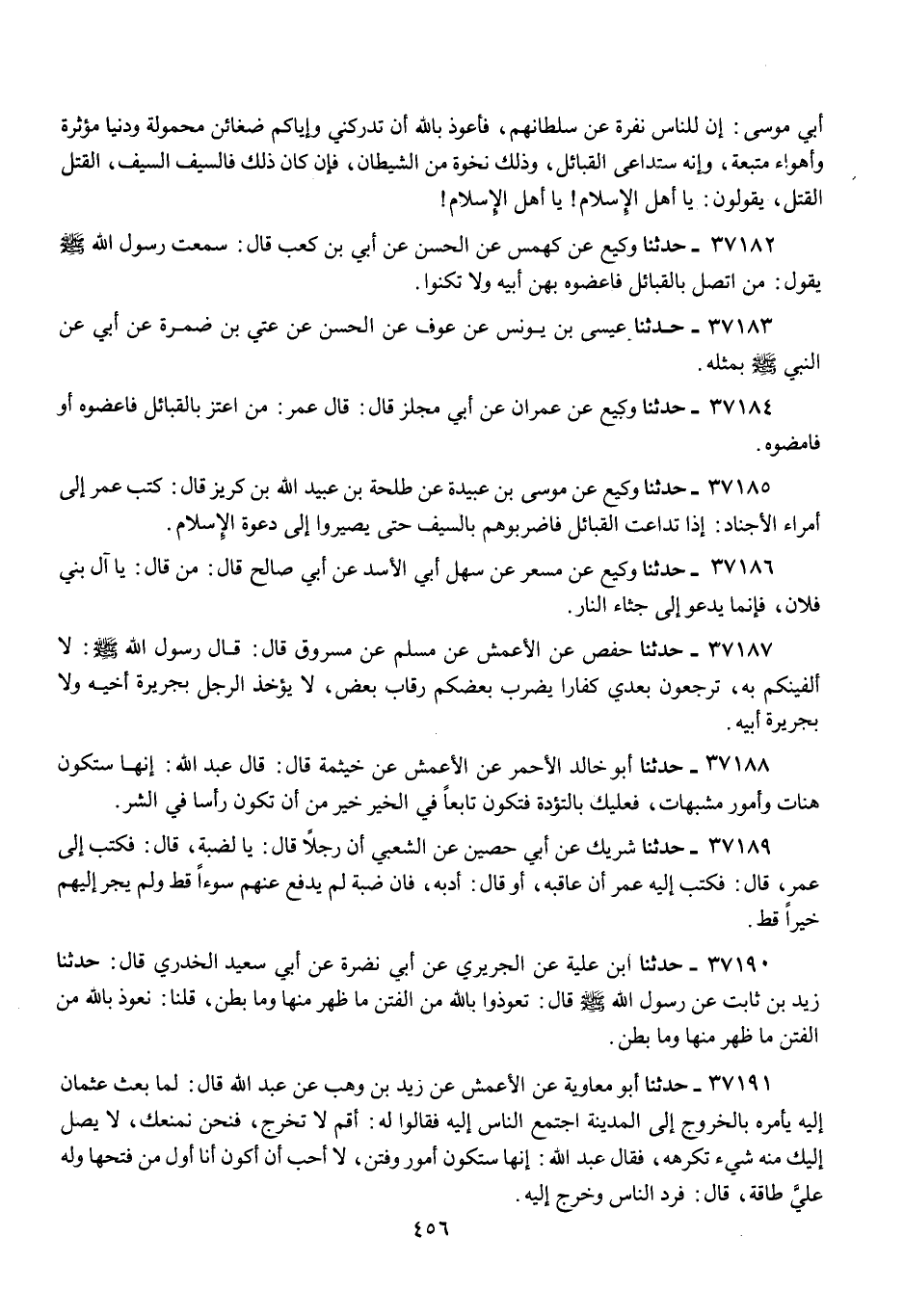 37191 - أَبُو مُعَاوِيَةَ، عَنِ الْأَعْمَشِ، عَنْ زَيْدِ بْنِ وَهْبٍ، عَنْ عَبْدِ اللَّهِ، قَالَ: لَمَّا بَعَثَ عُثْمَانُ إِلَيْهِ يَأْمُرُهُ بِالْخُرُوجِ إِلَى الْمَدِينَةِ اجْتَمَعَ النَّاسُ إِلَيْهِ فَقَالُوا لَهُ: أَقِمْ لَا تَخْرُجْ , فَنَحْنُ نَمْنَعُكَ , لَا يَصِلُ إِلَيْكَ مِنْهُ شَيْءٌ تَكْرَهُهُ , فَقَالَ عَبْدُ اللَّهِ: «إِنَّهَا §سَتَكُونُ أُمُورٌ وَفِتَنٌ , لَا أُحِبُّ أَنْ أَكُونَ أَنَا أَوَّلَ مَنْ فَتَحَهَا وَلَهُ عَلَيَّ طَاقَةٌ» , قَالَ: فَرَدَّ النَّاسَ وَخَرَجَ إِلَيْهِ