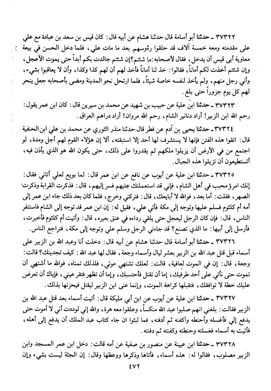 37327 - ابْنُ عُلَيَّةَ، عَنْ أَيُّوبَ، عَنِ ابْنِ أَبِي مُلَيْكَةَ، قَالَ: أَتَيْتُ أَسْمَاءَ بَعْدَ قَتْلِ عَبْدِ اللَّهِ بْنِ الزُّبَيْرِ فَقَالَتْ: " بَلَغَنِي إِنَّهُمْ §صَلَبُوا عَبْدَ اللَّهِ مُنَكَّسًا , وَعَلَّقُوا مَعَهُ هِرَّةً , وَاللَّهِ إِنِّي لَوَدِدْتُ أَنِّي لَا أَمُوتُ حَتَّى يُدْفَعَ إِلَيَّ فَأُغَسِّلَهُ وَأُحَنِّطَهُ وَأُكَفِّنَهُ ثُمَّ أَدْفِنَهُ , فَمَا لَبِثُوا أَنْ جَاءَ كِتَابُ عَبْدِ الْمَلِكِ أَنْ يُدْفَعَ إِلَى أَهْلِهِ , فَأَتَيْتُ بِهِ أَسْمَاءَ فَغَسَّلَتْهُ وَحَنَّطَتْهُ وَكَفَّنَتْهُ ثُمَّ دَفَنَتْهُ