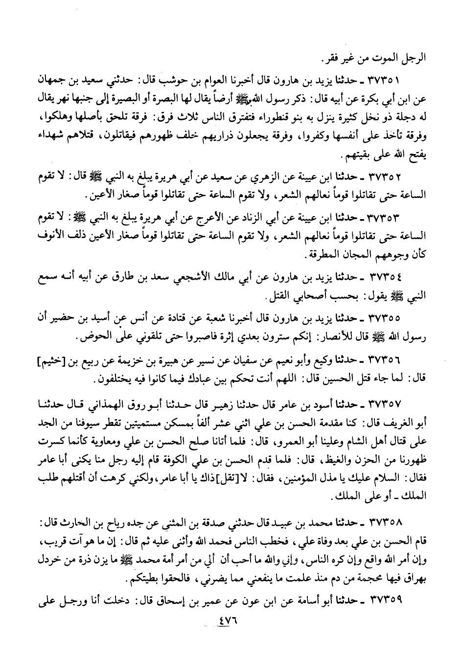 37354 - يَزِيدُ بْنُ هَارُونَ، عَنْ أَبِي مَالِكٍ الْأَشْجَعِيِّ سَعْدِ بْنِ طَارِقٍ، عَنْ أَبِيهِ، أَنَّهُ سَمِعَ النَّبِيَّ صَلَّى اللهُ عَلَيْهِ وَسَلَّمَ يَقُولُ: «§بِحَسْبِ أَصْحَابِي الْقَتْلُ»