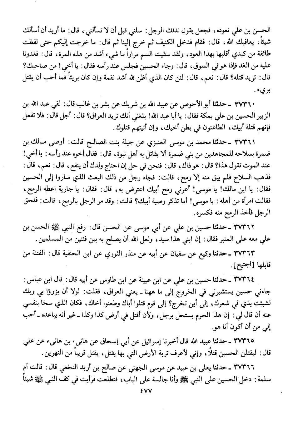 37360 - أَبُو الْأَحْوَصِ، عَنْ عُبَيْدِ اللَّهِ بْنِ شَرِيكٍ، عَنْ بِشْرِ بْنِ غَالِبٍ، قَالَ: لَقِيَ عَبْدُ اللَّهِ بْنُ الزُّبَيْرِ، الْحُسَيْنَ بْنَ عَلِيٍّ بِمَكَّةَ فَقَالَ: يَا أَبَا عَبْدِ اللَّهِ , «بَلَغَنِي أَنَّكَ تُرِيدُ الْعِرَاقَ؟» قَالَ: أَجَلْ , قَالَ: «§فَلَا تَفْعَلْ، فَإِنَّهُمْ قَتَلَةُ أَبِيكَ , الطَّاعِنُونَ فِي بَطْنِ أَخِيكَ , وَإِنْ أَتَيْتَهُمْ قَتَلُوكَ»
