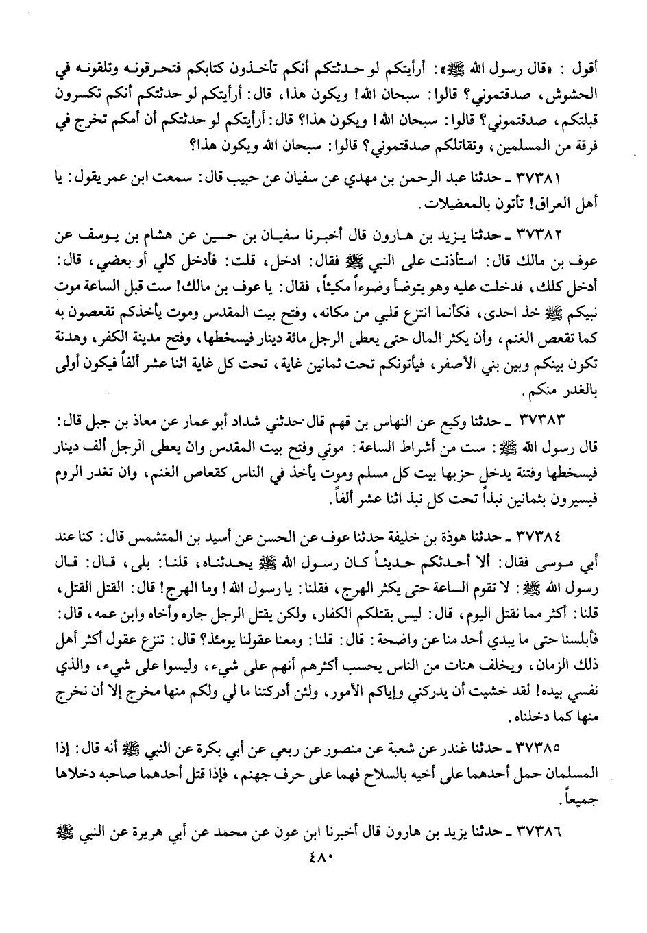 37382 - يَزِيدُ بْنُ هَارُونَ، قَالَ أَخْبَرَنَا سُفْيَانُ بْنُ حُسَيْنٍ، عَنْ هِشَامِ بْنِ يُوسُفَ، عَنْ عَوْفِ بْنِ مَالِكٍ، قَالَ: اسْتَأْذَنْتُ عَلَى النَّبِيِّ صَلَّى اللهُ عَلَيْهِ وَسَلَّمَ فَقَالَ: «ادْخُلْ» , قُلْتُ: فَأَدْخُلُ كُلِّي أَوْ بَعْضِي قَالَ: «ادْخُلْ كُلَّكَ ,» فَدَخَلْتُ عَلَيْهِ وَهُوَ يَتَوَضَّأُ وُضُوءًا مَكِيثًا , فَقَالَ: " يَا عَوْفَ بْنَ مَالِكٍ , §سِتٌّ قَبْلَ السَّاعَةِ: مَوْتُ نَبِيِّكُمْ صَلَّى اللهُ عَلَيْهِ وَسَلَّمَ، خُذْ إِحْدَى , فَكَأَنَّمَا انْتُزِعَ قَلْبِي مِنْ مَكَانِهِ , وَفَتْحُ بَيْتِ الْمَقْدِسِ، وَمَوْتٌ يَأْخُذُكُمْ تُقْعَصُونَ بِهِ كَمَا تُقْعَصُ الْغَنَمُ ; وَأَنْ يَكْثُرَ الْمَالُ حَتَّى يُعْطَى الرَّجُلُ مِائَةَ دِينَارٍ فَيَسْخَطُهَا , وَفَتْحُ مَدِينَةِ الْكُفْرِ ; وَهُدْنَةٌ تَكُونُ بَيْنَكُمْ وَبَيْنَ بَنِي الْأَصْفَرِ , فَيَأْتُونَكُمْ تَحْتَ ثَمَانِينَ غَايَةً , تَحْتَ كُلِّ غَايَةٍ اثْنَا عَشَرَ أَلْفًا فَيَكُونُونَ أَوْلَى بِالْغَدْرِ مِنْكُمْ "