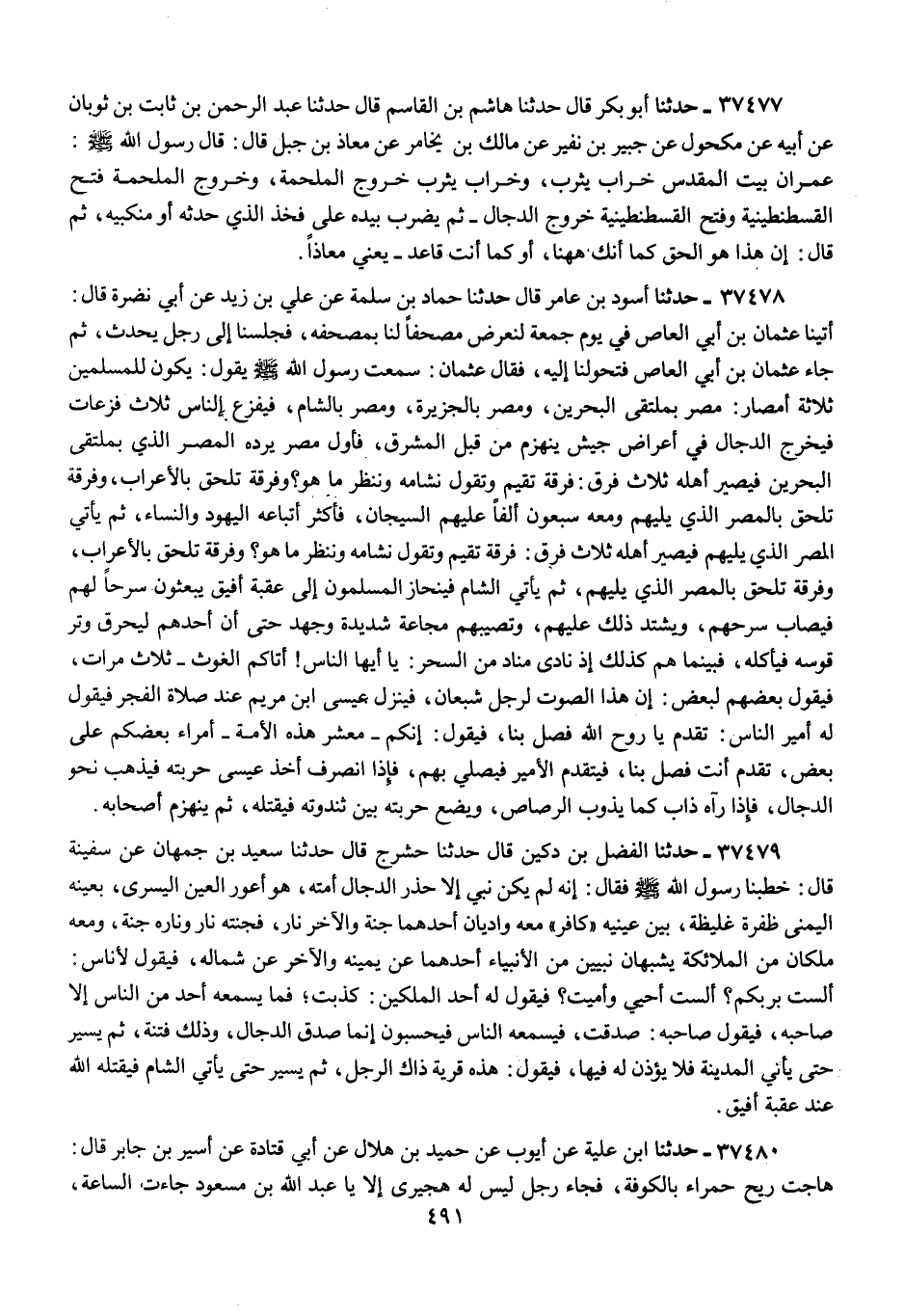 37478 - أَسْوَدُ بْنُ عَامِرٍ قَالَ حَدَّثَنَا حَمَّادُ بْنُ سَلَمَةَ، عَنْ عَلِيِّ بْنِ زَيْدٍ، عَنْ أَبِي نَضْرَةَ، قَالَ: أَتَيْنَا عُثْمَانَ بْنَ أَبِي الْعَاصِ فِي يَوْمِ جُمُعَةٍ لِنَعْرِضَ مُصْحَفًا لَنَا بِمُصْحَفِهِ , فَجَلَسْنَا إِلَى رَجُلٍ يُحَدِّثُ , ثُمَّ جَاءَ عُثْمَانُ بْنُ أَبِي الْعَاصِ فَتَحَوَّلْنَا إِلَيْهِ , فَقَالَ عُثْمَانُ: سَمِعْتُ رَسُولَ اللَّهِ صَلَّى اللهُ عَلَيْهِ وَسَلَّمَ يَقُولُ: " §يَكُونُ لِلْمُسْلِمِينَ ثَلَاثَةُ أَمْصَارٍ: مِصْرٌ بِمُلْتَقَى الْبَحْرَيْنِ , وَمِصْرٌ بِالْجَزِيرَةِ , وَمِصْرٌ بِالشَّامِ , فَيَفْزَعُ النَّاسُ ثَلَاثَ فَزَعَاتٍ فَيَخْرُجُ الدَّجَّالُ فِي أَعْرَاضِ جَيْشٍ يَنْهَزِمُ مِنْ قِبَلِ الْمَشْرِقِ , فَأَوَّلُ مِصْرٍ يَرِدُهُ الْمِصْرُ الَّذِي بِمُلْتَقَى الْبَحْرَيْنِ فَيَصِيرُ أَهْلُهُ ثَلَاثَ فِرَقٍ: فِرْقَةٌ تُقِيمُ وَتَقُولُ: نُشَامُّهُ وَنَنْظُرُ مَا هُوَ؟ وَفِرْقَةٌ تَلْحَقُ بِالْأَعْرَابِ , وَفِرْقَةٌ تَلْحَقُ بِالْمِصْرِ الَّذِي يَلِيهِمْ وَمَعَهُ سَبْعُونَ أَلْفًا عَلَيْهِمُ السِّيجَانُ , فَأَكْثَرُ أَتْبَاعِهِ الْيَهُودُ وَالنِّسَاءُ , ثُمَّ يَأْتِي الْمِصْرَ الَّذِي يَلِيهِمْ فَيَصِيرُ أَهْلُهُ ثَلَاثَ فِرَقٍ: فِرْقَةٌ تُقِيمُ وَتَقُولُ: نُشَامُّهُ وَنَنْظُرُ مَا هُوَ؟ وَفِرْقَةٌ تَلْحَقُ بِالْأَعْرَابِ , وَفِرْقَةٌ تَلْحَقُ بِالْمِصْرِ الَّذِي يَلِيهِمْ , ثُمَّ يَأْتِي الشَّامَ فَيَنْحَازُ الْمُسْلِمُونَ إِلَى عَقَبَةِ أَفِيقٍ يَبْعَثُونَ سَرْحًا لَهُمْ فَيُصَابُ سَرْحُهُمْ , وَيَشْتَدُّ ذَلِكَ عَلَيْهِمْ , وَتُصِيبُهُمْ مَجَاعَةٌ شَدِيدَةٌ وَجَهْدٌ حَتَّى إِنَّ أَحَدَهُمْ لَيُحْرِقُ وَتَرَ قَوْسِهِ فَيَأْكُلُهُ , فَبَيْنَمَا هُمْ كَذَلِكَ إِذْ نَادَى مُنَادٍ مِنَ السَّحَرِ: يَا أَيُّهَا النَّاسُ , أَتَاكُمُ الْغَوْثُ ثَلَاثَ مَرَّاتٍ , فَيَقُولُ بَعْضُهُمْ لِبَعْضٍ: إِنَّ هَذَا الصَّوْتَ لِرَجُلٍ شَبْعَانَ , فَيَنْزِلُ عِيسَى ابْنُ مَرْيَمَ عِنْدَ صَلَاةِ الْفَجْرِ فَيَقُولُ لَهُ أَمِيرُ النَّاسِ: تَقَدَّمْ يَا رُوحَ اللَّهِ فَصَلِّ بِنَا , فَيَقُولُ: إِنَّكُمْ مَعْشَرَ هَذِهِ الْأُمَّةِ أُمَرَاءُ بَعْضُكُمْ عَلَى بَعْضٍ , تَقَدَّمْ أَنْتَ فَصَلِّ بِنَا , فَيَتَقَدَّمُ الْأَمِيرُ فَيُصَلِّي بِهِمْ , فَإِذَا انْصَرَفَ أَخَذَ عِيسَى حَرْبَتَهُ فَيَذْهَبُ نَحْوَ الدَّجَّالِ , فَإِذَا رَآهُ ذَابَ كَمَا يَذُوبُ الرَّصَاصُ , وَيَضَعُ حَرْبَتَهُ بَيْنَ ثَنْدُوَتِهِ فَيَقْتُلُهُ , ثُمَّ يَنْهَزِمُ أَصْحَابُهُ "