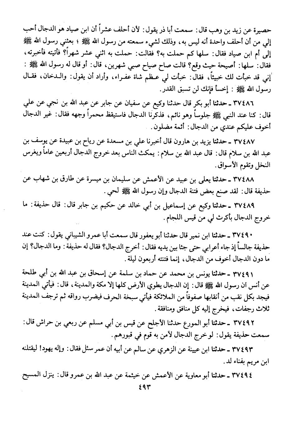 37493 - ابْنُ عُيَيْنَةَ عَنِ الزُّهْرِيِّ، عَنْ سَالِمٍ، عَنْ أَبِيهِ، أَنَّ عُمَرَ، سَأَلَ فَقَالَ: «وَإِلَهُ يَهُودٍ , §لَيَقْتُلَنَّهُ ابْنُ مَرْيَمَ بِفِنَاءِ لُدٍّ»