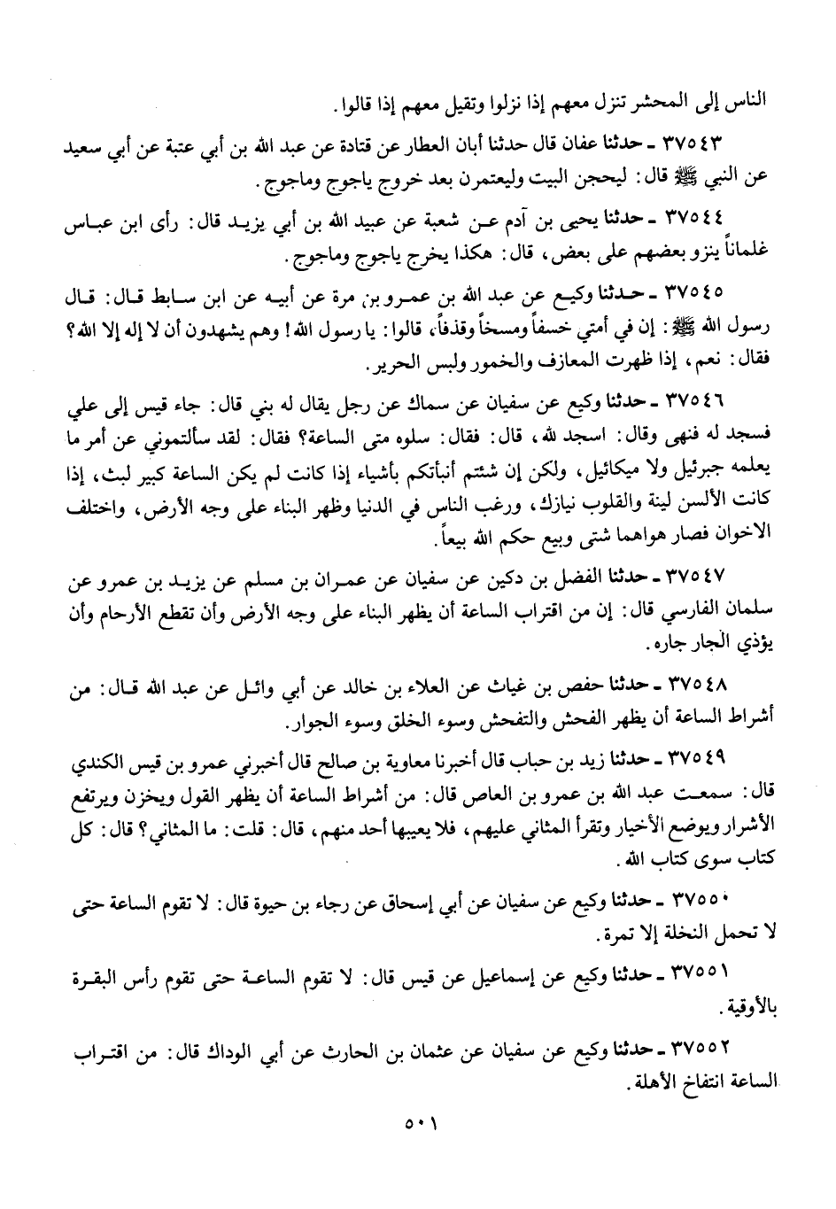 37547 - الْفَضْلُ بْنُ دُكَيْنٍ عَنْ سُفْيَانَ، عَنْ عِمْرَانَ بْنِ مُسْلِمٍ، عَنْ يَزِيدَ بْنِ عَمْرٍو، عَنْ سَلْمَانَ الْفَارِسِيِّ، قَالَ: «إِنَّ §مِنَ اقْتِرَابِ السَّاعَةِ أَنْ يَظْهَرَ الْبِنَاءُ عَلَى وَجْهِ الْأَرْضِ، وَأَنْ تُقْطَعَ الْأَرْحَامُ، وَأَنْ يُؤْذِيَ الْجَارُ جَارَهُ»