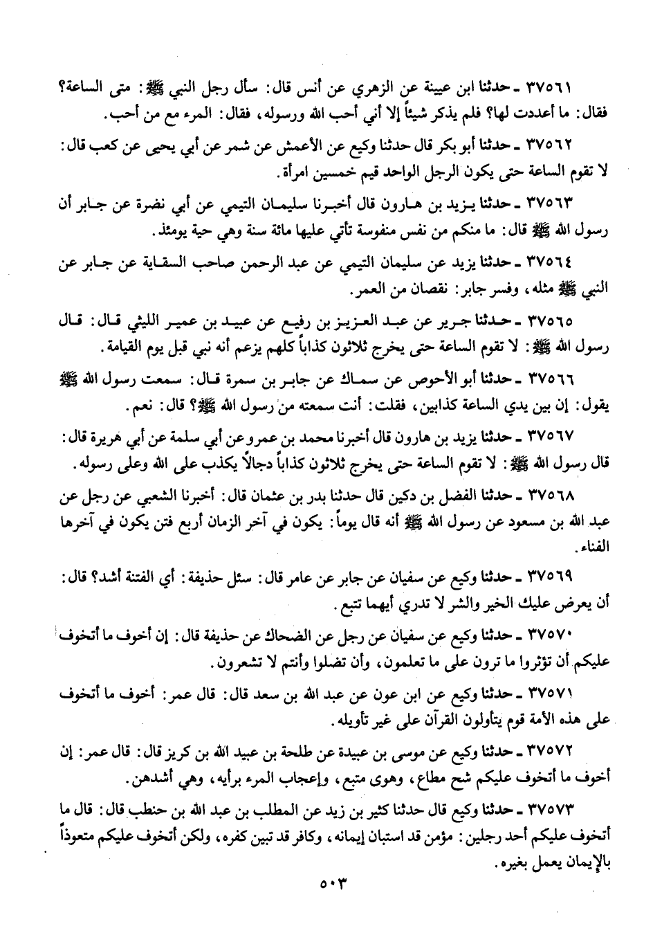37565 - جَرِيرٌ عَنْ عَبْدِ الْعَزِيزِ بْنِ رُفَيْعٍ، عَنْ عُبَيْدِ بْنِ عُمَيْرٍ اللَّيْثِيِّ، قَالَ: قَالَ رَسُولُ اللَّهِ صَلَّى اللهُ عَلَيْهِ وَسَلَّمَ: «§لَا تَقُومُ السَّاعَةُ حَتَّى يَخْرُجَ ثَلَاثُونَ كَذَّابًا، كُلُّهُمْ يَزْعُمُ أَنَّهُ نَبِيٌّ قَبْلَ يَوْمِ الْقِيَامَةِ»