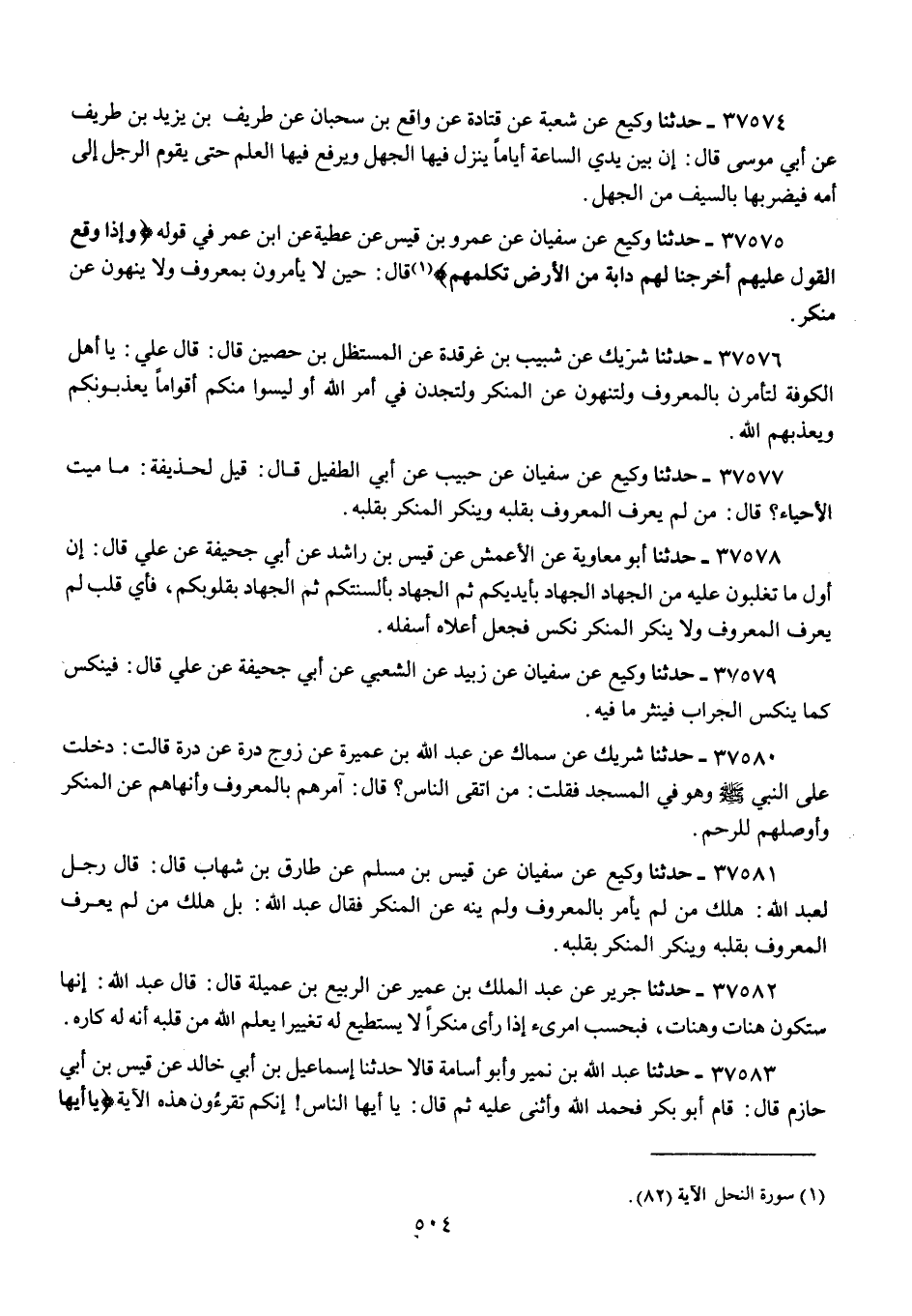37581 - وَكِيعٌ عَنْ سُفْيَانَ، عَنْ قَيْسِ بْنِ مُسْلِمٍ، عَنْ طَارِقِ بْنِ شِهَابٍ، قَالَ قَالَ: رَجُلٌ لِعَبْدِ اللَّهِ: هَلَكَ مَنْ لَمْ يَأْمُرْ بِالْمَعْرُوفِ وَلَمْ يَنْهَ عَنِ الْمُنْكَرِ، فَقَالَ عَبْدُ اللَّهِ «بَلْ §هَلَكَ مَنْ لَمْ يَعْرِفِ الْمَعْرُوفَ بِقَلْبِهِ، وَيُنْكِرِ الْمُنْكَرَ بِقَلْبِهِ»