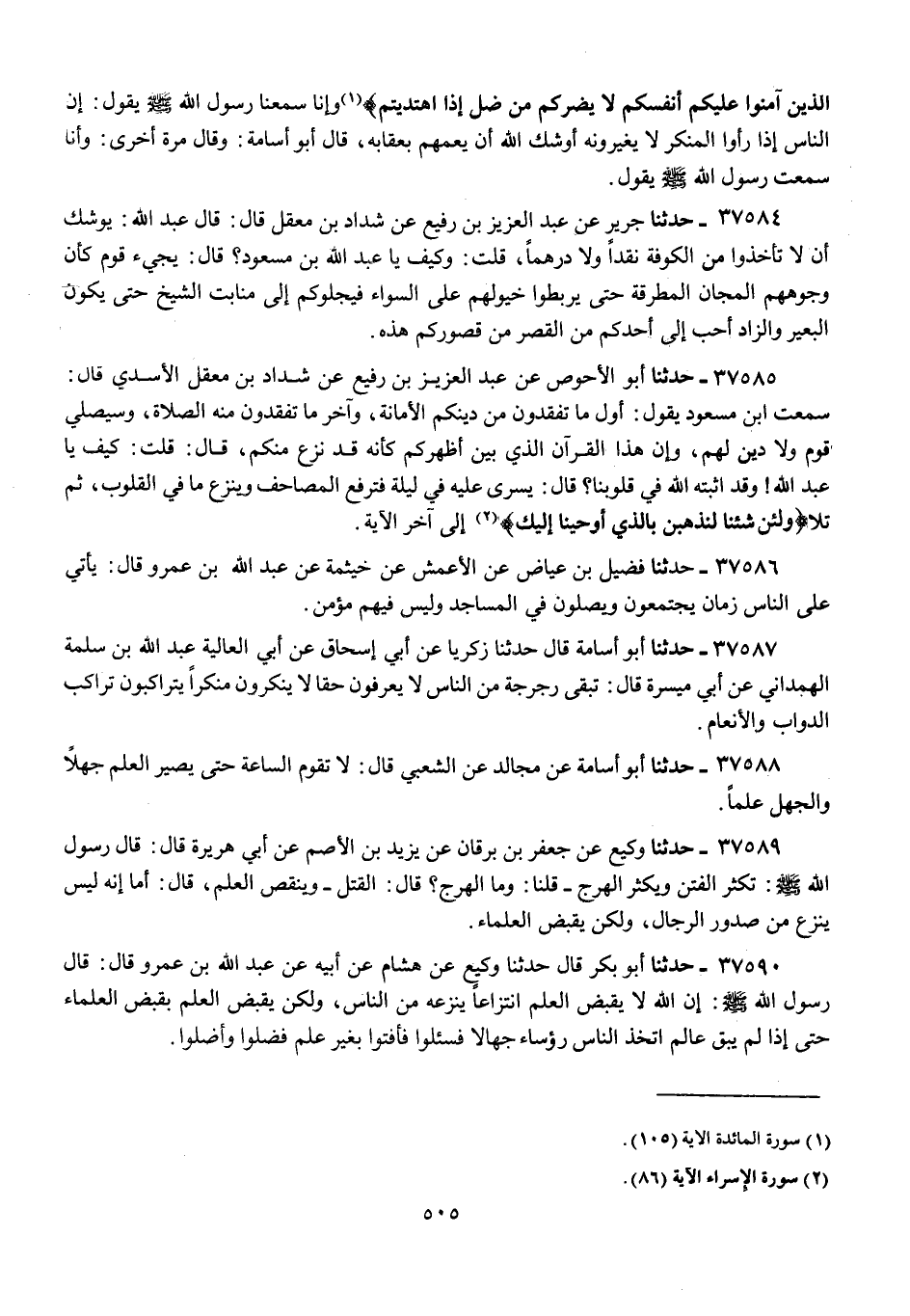 37585 - أَبُو الْأَحْوَصِ عَنْ عَبْدِ الْعَزِيزِ بْنِ رُفَيْعٍ، عَنْ شَدَّادِ بْنِ مَعْقِلٍ الْأَسَدِيِّ، قَالَ: سَمِعْتُ ابْنَ مَسْعُودٍ، يَقُولُ: «§أَوَّلُ مَا تَفْقِدُونَ مِنْ دِينِكُمُ الْأَمَانَةُ , وَآخِرُ مَا تَفْقِدُونَ مِنْهُ الصَّلَاةُ , وَسَيُصَلِّي قَوْمٌ وَلَا دِينَ لَهُمْ , وَإِنَّ هَذَا الْقُرْآنَ الَّذِي بَيْنَ أَظْهُرِكُمْ كَأَنَّهُ قَدْ نُزِعَ مِنْكُمْ» , قَالَ: قُلْتُ: كَيْفَ يَا عَبْدَ اللَّهِ , وَقَدْ أَثْبَتَهُ اللَّهُ فِي قُلُوبِنَا؟ قَالَ: " يَسْرِي عَلَيْهِ فِي لَيْلَةٍ فَتُرْفَعُ الْمَصَاحِفُ، وَيُنْزَعُ مَا فِي الْقُلُوبِ , ثُمَّ تَلَا {وَلَئِنْ شِئْنَا لَنَذْهَبَنَّ بِالَّذِي أَوْحَيْنَا إِلَيْكَ} [الإسراء: 86] " إِلَى آخِرِ الْآيَةِ