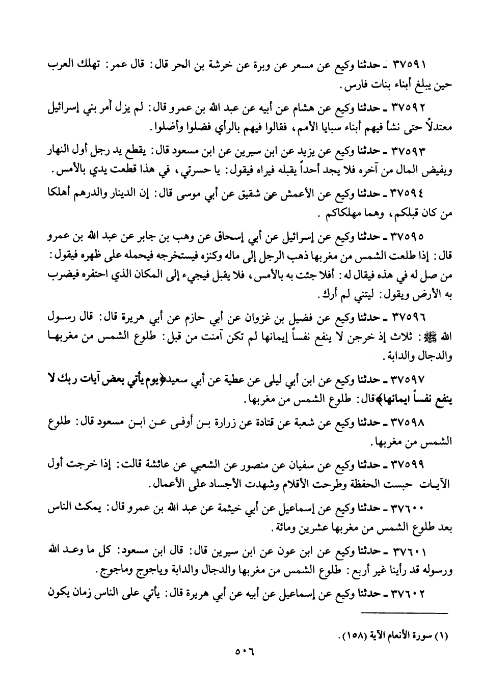 37600 - وَكِيعٌ عَنْ إِسْمَاعِيلَ، عَنْ أَبِي خَيْثَمَةَ، عَنْ عَبْدِ اللَّهِ بْنِ عَمْرٍو، قَالَ: «§يَمْكُثُ النَّاسُ بَعْدَ طُلُوعِ الشَّمْسِ مِنْ مَغْرِبِهَا عِشْرِينَ وَمِائَةً»