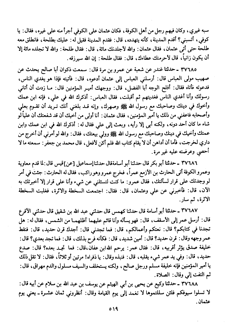 37685 - غُنْدَرٌ عَنْ شُعْبَةَ، عَنْ عَمْرِو بْنِ مُرَّةَ، قَالَ: سَمِعْتُ ذَكْوَانَ أَبَا صَالِحٍ، يُحَدِّثُ عَنْ صُهَيْبٍ، مَوْلَى الْعَبَّاسِ قَالَ: أَرْسَلَنِي الْعَبَّاسُ إِلَى عُثْمَانَ أَدْعُوهُ , قَالَ: فَأَتَيْتُهُ فَإِذَا هُوَ يُغَدِّي النَّاسَ , فَدَعَوْتُهُ فَأَتَاهُ فَقَالَ: أَفْلَحَ الْوَجْهُ أَبَا الْفَضْلِ , قَالَ: وَوَجْهُكَ أَمِيرَ الْمُؤْمِنِينَ , قَالَ: مَا زِدْتُ أَنْ أَتَانِي رَسُولُكَ وَأَنَا أَغُدِّي النَّاسَ فَغَدَّيْتُهُمْ ثُمَّ أَقْبَلْتُ , فَقَالَ الْعَبَّاسُ: أُذَكِّرُكَ اللَّهَ فِي عَلِيٍّ , فَإِنَّهُ ابْنُ عَمِّكَ وَأَخُوكَ فِي دِينِكَ وَصَاحِبُكَ مَعَ رَسُولِ اللَّهِ صَلَّى اللهُ عَلَيْهِ وَسَلَّمَ وَصِهْرُكَ , وَإِنَّهُ قَدْ بَلَغَنِي أَنَّكَ تُرِيدُ أَنْ تَقُومَ بِعَلِيٍّ وَأَصْحَابِهِ فَاعْفِنِي مِنْ ذَلِكَ يَا أَمِيرَ الْمُؤْمِنِينَ , فَقَالَ عُثْمَانُ: أَنَا أَوْلَى مِنْ أَخِيكَ أَنْ قَدْ شَفَّعْتُكَ أَنَّ عَلِيًّا لَوْ شَاءَ مَا كَانَ أَحَدٌ دُونَهُ , وَلَكِنَّهُ أَبَى إِلَّا رَأْيَهُ , وَبَعَثَ إِلَى عَلِيٍّ فَقَالَ لَهُ: " أُذَكِّرُكَ اللَّهَ فِي ابْنِ عَمِّكَ وَابْنِ عَمَّتِكَ وَأَخِيكَ فِي دِينِكَ وَصَاحِبِكَ مَعَ رَسُولِ اللَّهِ صَلَّى اللهُ عَلَيْهِ وَسَلَّمَ وَوَلِيِّ بَيْعَتِكَ , فَقَالَ: وَاللَّهِ §لَوْ أَمَرَنِي أَنْ أَخْرُجَ مِنْ دَارِي لَخَرَجْتُ , فَأَمَّا أَنْ أُدَاهِنَ أَنْ لَا يُقَامَ كِتَابُ اللَّهِ فَلَمْ أَكُنْ لِأَفْعَلَ " , قَالَ مُحَمَّدُ بْنُ جَعْفَرٍ: سَمِعْتُهُ مَا لَا أُحْصِي وَعَرَضْتُهُ عَلَيْهِ غَيْرَ مَرَّةٍ