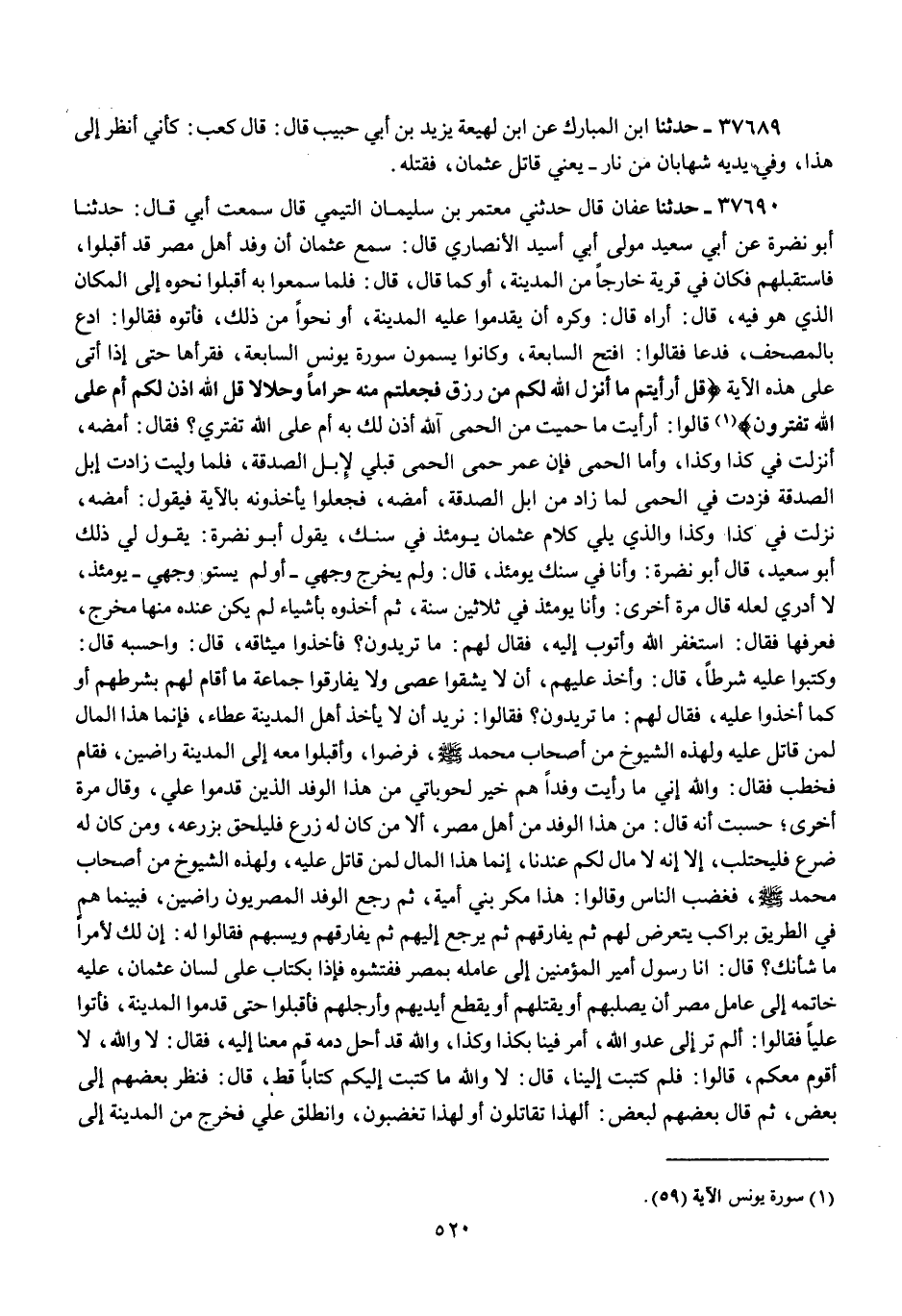 37690 - عَفَّانُ قَالَ حَدَّثَنِي مُعْتَمِرُ بْنُ سُلَيْمَانَ التَّيْمِيُّ، قَالَ: سَمِعْتُ أَبِي قَالَ: حَدَّثَنَا أَبُو نَضْرَةَ، عَنْ أَبِي سَعِيدٍ، مَوْلَى أَبِي أُسَيْدٍ الْأَنْصَارِيِّ قَالَ: §سَمِعَ عُثْمَانُ أَنَّ وَفْدَ أَهْلِ مِصْرَ قَدْ أَقْبَلُوا , فَاسْتَقْبَلَهُمْ فَكَانَ فِي قَرْيَةٍ خَارِجًا مِنَ الْمَدِينَةِ , أَوْ كَمَا قَالَ , قَالَ: فَلَمَّا سَمِعُوا بِهِ أَقْبَلُوا نَحْوَهُ إِلَى الْمَكَانِ الَّذِي هُوَ فِيهِ , قَالَ: أَرَاهُ قَالَ: وَكَرِهَ أَنْ يَقْدُمُوا عَلَيْهِ الْمَدِينَةَ , أَوْ نَحْوًا مِنْ ذَلِكَ , فَأَتَوْهُ فَقَالُوا: ادْعُ بِالْمُصْحَفِ , فَدَعَا بِالْمُصْحَفِ فَقَالُوا: افْتَحِ السَّابِعَةَ , وَكَانُوا يُسَمُّونَ سُورَةَ يُونُسَ السَّابِعَةَ , فَقَرَأَهَا حَتَّى إِذَا أَتَى عَلَى هَذِهِ الْآيَةِ: {قُلْ أَرَأَيْتُمْ مَا أَنْزَلَ اللَّهُ لَكُمْ مِنْ رِزْقٍ فَجَعَلْتُمْ مِنْهُ حَرَامًا وَحَلَالًا قُلْ آللَّهُ أَذِنَ لَكُمْ أَمْ عَلَى اللَّهِ تَفْتَرُونَ} [يونس: 59] قَالُوا: أَرَأَيْتَ مَا حَمَيْتَ مِنَ الْحِمَى آللَّهُ أَذِنَ لَكَ بِهِ أَمْ عَلَى اللَّهِ تَفْتَرِي؟ فَقَالَ: أَمْضِهِ , أُنْزِلَتْ فِي كَذَا وَكَذَا , وَأَمَّا الْحِمَى فَإِنَّ عُمَرَ حَمَى الْحِمَى قَبْلِي لِإِبِلِ الصَّدَقَةِ ; فَلَمَّا وُلِّيتُ زَادَتْ إِبِلُ الصَّدَقَةِ فَزِدْتُ فِي الْحِمَى لِمَا زَادَ مِنْ إِبِلِ الصَّدَقَةِ ; أَمْضِهِ , فَجَعَلُوا يَأْخُذُونَهُ بِالْآيَةِ فَيَقُولُ: أَمْضِهِ , نَزَلَتْ فِي كَذَا وَكَذَا وَالَّذِي يَلِي كَلَامَ عُثْمَانَ يَوْمَئِذٍ فِي سِنِّكَ , يَقُولُ أَبُو نَضْرَةَ: يَقُولُ لِي ذَلِكَ أَبُو سَعِيدٍ , قَالَ أَبُو نَضْرَةَ: وَأَنَا فِي سِنِّكَ يَوْمَئِذٍ ; قَالَ: وَلَمْ يَخْرُجْ وَجْهِي أَوْ لَمْ يَسْتَوِ وَجْهِي يَوْمَئِذٍ , لَا أَدْرِي لَعَلَّهُ قَالَ مَرَّةً أُخْرَى: وَأَنَا يَوْمَئِذٍ فِي ثَلَاثِينَ سَنَةً ; ثُمَّ أَخَذُوهُ بِأَشْيَاءَ لَمْ يَكُنْ عِنْدَهُ مِنْهَا مَخْرَجٌ , فَعَرَفَهَا فَقَالَ: أَسْتَغْفِرُ اللَّهَ وَأَتُوبُ إِلَيْهِ , فَقَالَ لَهُمْ: مَا تُرِيدُونَ؟ فَأَخَذُوا مِيثَاقَهُ , قَالَ: وَأَحْسِبُهُ قَالَ: وَكَتَبُوا عَلَيْهِ شَرْطًا , قَالَ: وَأَخَذَ عَلَيْهِمْ , أَنْ لَا يَشُقُّوا عَصًا وَلَا يُفَارِقُوا جَمَاعَةً مَا أَقَامَ لَهُمْ بِشَرْطِهِمْ أَوْ كَمَا أَخَذُوا عَلَيْهِ , فَقَالَ لَهُمْ: مَا تُرِيدُونَ؟ فَقَالُوا: نُرِيدُ أَنْ لَا يَأْخُذَ أَهْلُ الْمَدِينَةِ عَطَاءً , فَإِنَّمَا هَذَا الْمَالُ لِمَنْ قَاتَلَ عَلَيْهِ وَلِهَذِهِ الشُّيُوخِ مِنْ أَصْحَابِ مُحَمَّدٍ صَلَّى اللهُ عَلَيْهِ وَسَلَّمَ فَرَضُوا , وَأَقْبَلُوا مَعَهُ إِلَى الْمَدِينَةِ رَاضِينَ , فَقَامَ فَخَطَبَ فَقَالَ: وَاللَّهِ إِنِّي مَا رَأَيْتُ وَفْدًا هُمْ خَيْرٌ لِحَوْبَاتِي مِنْ هَذَا الْوَفْدِ الَّذِينَ قَدِمُوا عَلَيَّ , وَقَالَ مَرَّةً أُخْرَى: حَسِبْتُ أَنَّهُ قَالَ: مِنْ هَذَا الْوَفْدِ مِنْ أَهْلِ مِصْرَ , أَلَا مَنْ كَانَ لَهُ زَرْعٌ فَلْيَلْحَقْ بِزَرْعِهِ , وَمَنْ كَانَ لَهُ ضَرْعٌ فَلْيَحْتَلِبْ , أَلَا إِنَّهُ لَا مَالَ لَكُمْ عِنْدَنَا , إِنَّمَا هَذَا الْمَالُ لِمَنْ قَاتَلَ عَلَيْهِ , وَلِهَذِهِ الشُّيُوخِ مِنْ أَصْحَابِ مُحَمَّدٍ صَلَّى اللهُ عَلَيْهِ وَسَلَّمَ فَغَضِبَ النَّاسُ وَقَالُوا: هَذَا مَكْرُ بَنِي أُمَيَّةَ , ثُمَّ رَجَعَ الْوَفْدُ الْمِصْرِيُّونَ رَاضِينَ , فَبَيْنَمَا هُمْ فِي الطَّرِيقِ إِذْ بِرَاكِبٍ يَتَعَرَّضُ لَهُمْ ثُمَّ يُفَارِقُهُمْ ثُمَّ يَرْجِعُ إِلَيْهِمْ ثُمَّ يُفَارِقُهُمْ وَيَسُبُّهُمْ , فَقَالُوا لَهُ: إِنَّ لَكَ لَأَمْرًا مَا شَأْنُكَ؟ قَالَ: أَنَا رَسُولُ أَمِيرِ الْمُؤْمِنِينَ إِلَى عَامِلِهِ بِمِصْرَ فَفَتَّشُوهُ فَإِذَا بِ