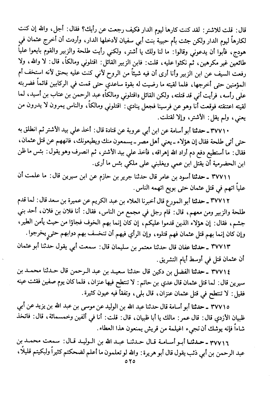 37710 - أَبُو أُسَامَةَ عَنِ ابْنِ أَبِي عَرُوبَةَ، عَنْ قَتَادَةَ، قَالَ: أَخَذَ عَلِيٌّ بِيَدِ الْأَشْتَرِ ثُمَّ انْطَلَقَ بِهِ حَتَّى أَتَى طَلْحَةَ فَقَالَ إِنَّ هَؤُلَاءِ يَعْنِي أَهْلَ مِصْرَ يَسْمَعُونَ مِنْكَ وَيُطِيعُونَكَ , فَانْهَهُمْ عَنْ قَتْلِ عُثْمَانَ , فَقَالَ: مَا أَسْتَطِيعُ دَفْعَ دَمٍ أَرَادَ اللَّهُ إِهْرَاقَهُ ; فَأَخَذَ عَلِيٌّ بِيَدِ الْأَشْتَرِ , ثُمَّ انْصَرَفَ وَهُوَ يَقُولُ: §بِئْسَ مَا ظَنَّ ابْنُ الْحَضْرَمِيَّةِ أَنْ يَقْتُلَ ابْنَ عَمِّي وَيَغْلِبَنِي عَلَى مُلْكِي بِئْسَ مَا أَرَى