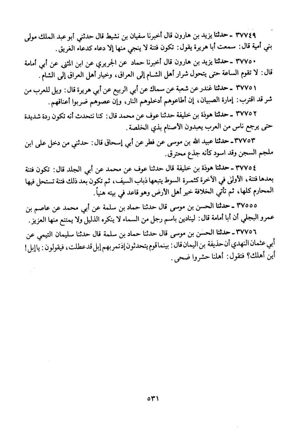 37749 - يَزِيدُ بْنُ هَارُونَ قَالَ: أَخْبَرَنَا سُفْيَانُ بْنُ نَشِيطٍ، قَالَ حَدَّثَنِي أَبُو عَبْدِ الْمَلِكِ، مَوْلَى بَنِي أُمَيَّةَ قَالَ: سَمِعْتُ أَبَا هُرَيْرَةَ، يَقُولُ: «§تَكُونُ فِتْنَةٌ لَا يُنْجِي مِنْهَا إِلَّا دُعَاءٌ كَدُعَاءِ الْغَرِيقِ»