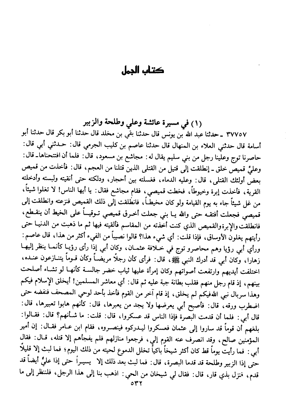 37757 - عَبْدُ اللَّهِ بْنُ يُونُسَ، قَالَ: حَدَّثَنَا بَقِيُّ بْنُ مَخْلَدٍ، قَالَ: حَدَّثَنَا أَبُو بَكْرٍ، قَالَ حَدَّثَنَا أَبُو أُسَامَةَ، قَالَ: حَدَّثَنِي الْعَلَاءُ بْنُ الْمِنْهَالِ، قَالَ حَدَّثَنَا عَاصِمُ بْنُ كُلَيْبٍ الْجَرْمِيِّ، قَالَ: حَدَّثَنِي أَبِي قَالَ: حَاصَرْنَا تَوَّجَ وَعَلَيْنَا رَجُلٌ مِنْ بَنِي سُلَيْمٍ يُقَالُ لَهُ: مُجَاشِعُ بْنُ مَسْعُودٍ , قَالَ: فَلَمَّا أَنِ افْتَتَحْنَاهَا، قَالَ: وَعَلَيَّ قَمِيصٌ خَلِقٌ انْطَلَقْتُ إِلَى قَتِيلٍ مِنَ الْقَتْلَى الَّذِينَ قَتَلْنَا مِنَ الْعَجَمِ , قَالَ: فَأَخَذْتُ مِنْ قَمِيصِ بَعْضِ أُولَئِكَ الْقَتْلَى , قَالَ: وَعَلَيْهِ الدِّمَاءُ , فَغَسَلْتُهُ بَيْنَ أَحْجَارٍ , وَدَلَّكْتُهُ حَتَّى أَنْقَيْتَهُ وَلَبِسْتَهُ وَأَدْخَلْتَهُ الْقَرْيَةَ , فَأَخَذْتُ إِبْرَةً وَخُيُوطًا , فَخِطْتُ قَمِيصِي , فَقَامَ مُجَاشِعٌ فَقَالَ: يَا أَيُّهَا النَّاسُ , §لَا تَغُلُّوا شَيْئًا , مَنْ غَلَّ شَيْئًا جَاءَ بِهِ يَوْمَ الْقِيَامَةِ وَلَوْ كَانَ مِخْيَطًا , فَانْطَلَقْتُ إِلَى ذَلِكَ الْقَمِيصِ فَنَزَعْتُهُ وَانْطَلَقْتُ إِلَى قَمِيصِي فَجَعَلْتُ أَفْتُقُهُ حَتَّى وَاللَّهِ يَا بُنَيَّ جَعَلْتُ أَخْرِقُ قَمِيصِي تَوَقِّيًا عَلَى الْخَيْطِ أَنْ يَنْقَطِعَ ; فَانْطَلَقْتُ وَالْإِبْرَةُ وَالْقَمِيصُ الَّذِي كُنْتُ أَخَذْتُهُ مِنَ الْمَقَاسِمِ فَأَلْقَيْتُهُ فِيهَا ثُمَّ مَا ذَهَبْتُ مِنَ الدُّنْيَا حَتَّى رَأَيْتُهُمْ يَغُلُّونَ الْأَوْسَاقَ , فَإِذَا قُلْتَ: أَيُّ شَيْءٍ هَذَا؟ قَالُوا نَصِيبُنَا مِنَ الْفَيْءِ أَكْثَرُ مِنْ هَذَا قَالَ عَاصِمٌ: وَرَأَى أَبِي رُؤْيَا وَهُمْ مُحَاصِرُو تَوَّجَ فِي خِلَافَةِ عُثْمَانَ , وَكَانَ أَبِي إِذَا رَأَى رُؤْيَا كَأَنَّمَا يَنْظُرُ إِلَيْهَا زَهَارًا , وَكَانَ أَبِي قَدْ أَدْرَكَ النَّبِيَّ صَلَّى اللهُ عَلَيْهِ وَسَلَّمَ قَالَ: فَرَأَى كَأَنَّ رَجُلًا مَرِيضًا وَكَأَنَّ قَوْمًا يَتَنَازَعُونَ عِنْدَهُ , اخْتَلَفَتْ أَيْدِيهِمْ وَارْتَفَعَتْ أَصْوَاتُهُمْ وَكَانَتِ امْرَأَةٌ عَلَيْهَا ثِيَابٌ خُضْرٌ جَالِسَةً كَأَنَّهَا لَوْ تَشَاءُ أَصْلَحَتْ بَيْنَهُمْ , إِذْ قَامَ رَجُلٌ مِنْهُمْ فَقَلَبَ بِطَانَةَ جُبَّةٍ عَلَيْهِ ثُمَّ قَالَ: أَيْ مَعَاشِرَ الْمُسْلِمِينَ , أَيَخْلَقُ الْإِسْلَامُ فِيكُمْ وَهَذَا سِرْبَالُ نَبِيِّ اللَّهِ فِيكُمْ لَمْ يَخْلَقْ , إِذْ قَامَ آخَرُ مِنَ الْقَوْمِ فَأَخَذَ بِأَحَدِ لَوْحَيِ الْمُصْحَفِ فَنَفَضَهُ حَتَّى اضْطَرَبَ وَرَقُهُ , قَالَ: فَأَصْبَحَ أَبِي يَعْرِضُهَا وَلَا يَجِدُ مَنْ يُعَبِّرُهَا , قَالَ: كَأَنَّهُمْ هَابُوا تَعْبِيرَهَا , قَالَ: قَالَ أَبِي: فَلَمَّا أَنْ قَدِمْتُ الْبَصْرَةَ فَإِذَا النَّاسُ قَدْ عَسْكَرُوا , قَالَ: قُلْتُ: مَا شَأْنُهُمْ؟ قَالَ: فَقَالُوا: بَلَغَهُمْ أَنَّ قَوْمًا قَدْ سَارُوا إِلَى عُثْمَانَ فَعَسْكَرُوا لِيُدْرِكُوهُ فَيَنْصُرُوهُ , فَقَامَ ابْنُ عَامِرٍ فَقَالَ: إِنَّ أَمِيرَ الْمُؤْمِنِينَ صَالِحٌ , وَقَدِ انْصَرَفَ عَنْهُ الْقَوْمُ , فَرَجَعُوا إِلَى مَنَازِلِهِمْ فَلَمْ يَفْجَأْهُمْ إِلَّا قَتْلُهُ , قَالَ: فَقَالَ أَبِي: فَمَا رَأَيْتُ يَوْمًا قَطُّ كَانَ أَكْثَرَ شَيْخًا بَاكِيًا تُخَلِّلُ الدُّمُوعُ لِحْيَتَهُ مِنْ ذَلِكَ الْيَوْمِ ; فَمَا لَبِثَ إِلَّا قَلِيلًا حَتَّى إِذَا الزُّبَيْرُ وَطَلْحَةُ قَدْ قَدِمَا الْبَصْرَةَ , قَالَ: فَمَا لَبِثْتُ بَعْدَ ذَلِكَ إِلَّا يَسِيرًا حَتَّى إِذَا عَلِيٌّ أَيْضًا قَدْ قَدِمَ , فَنَزَلَ بِذِي قَارٍ , قَالَ: فَقَالَ لِي شَيْخَانِ مِنَ الْحَيِّ: اذْهَبْ بِنَا إِلَى هَذَا الرَّجُلِ , فَلْنَنْظُرْ إِلَى مَا -[533]- يَدْعُو , وَأَيُّ شَيْءٍ جَاءَ بِهِ , فَخَرَجْنَا حَتَّى إِذَا دَن